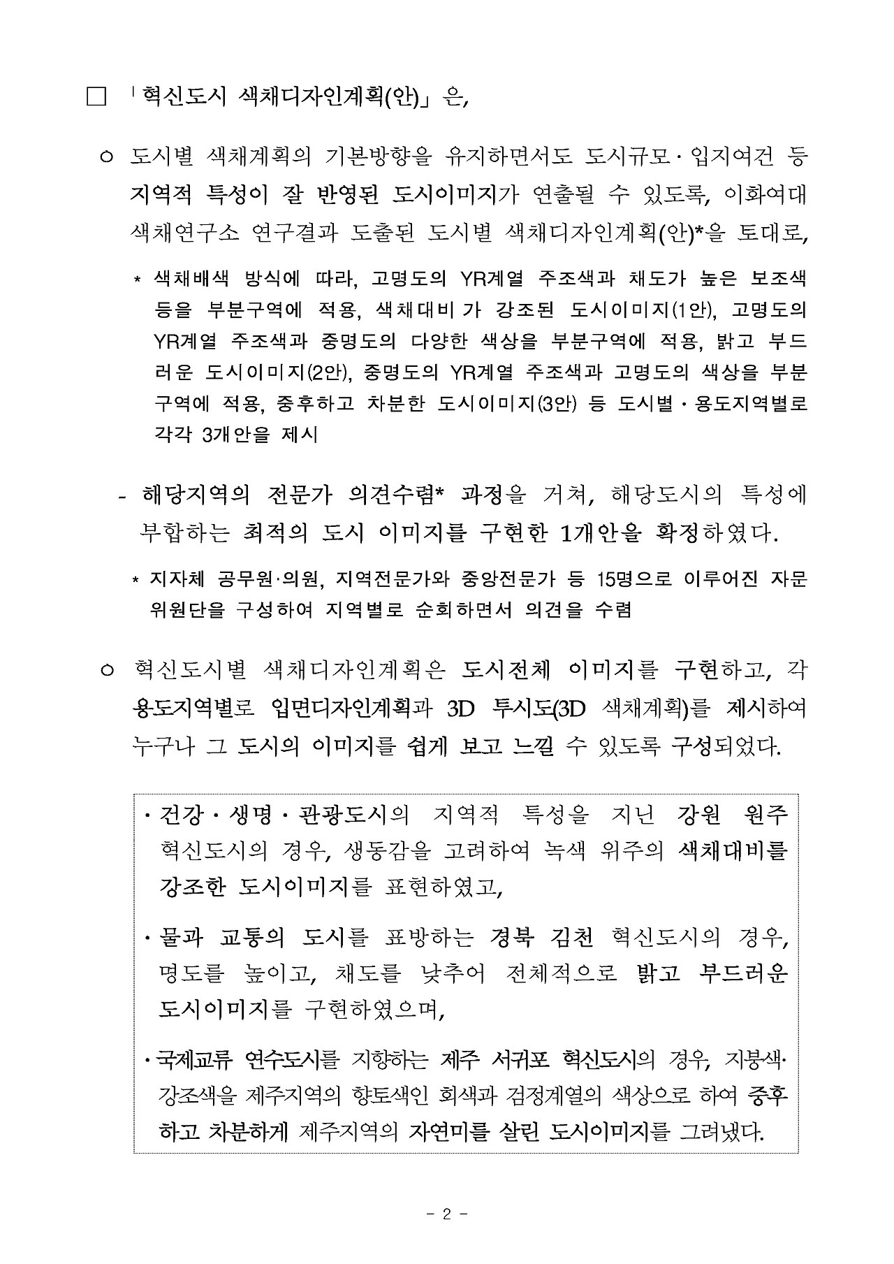 당위성의 문제도 있다. 대체 무엇을 위해 도시를 색으로 구분하거나 통일해야 한단 말인가? 각 도시에 ‘특정 색상 건물이 많다’는 인지 정보가 어떤 의미로 연결될 수 있을지 의문이다. 건물 색칠하기를 통해 보여주려 하는 혁신도시별 특성은 무엇이며, 그것이 색과 어떻게 연결되는지, 또 정부 기관이 나서 챙길 만큼 중요한 가치인지를 먼저 짚어봐야 한다.