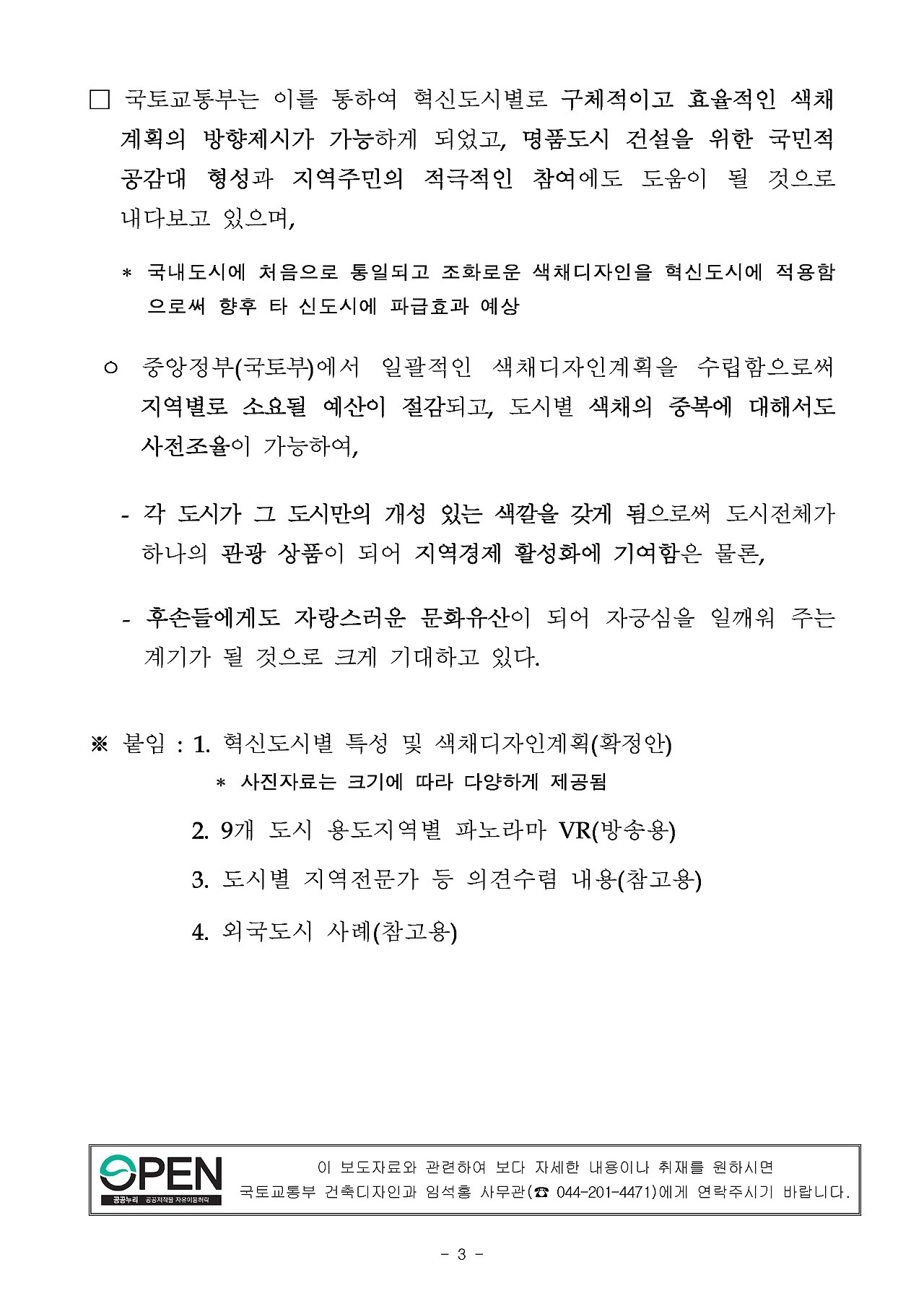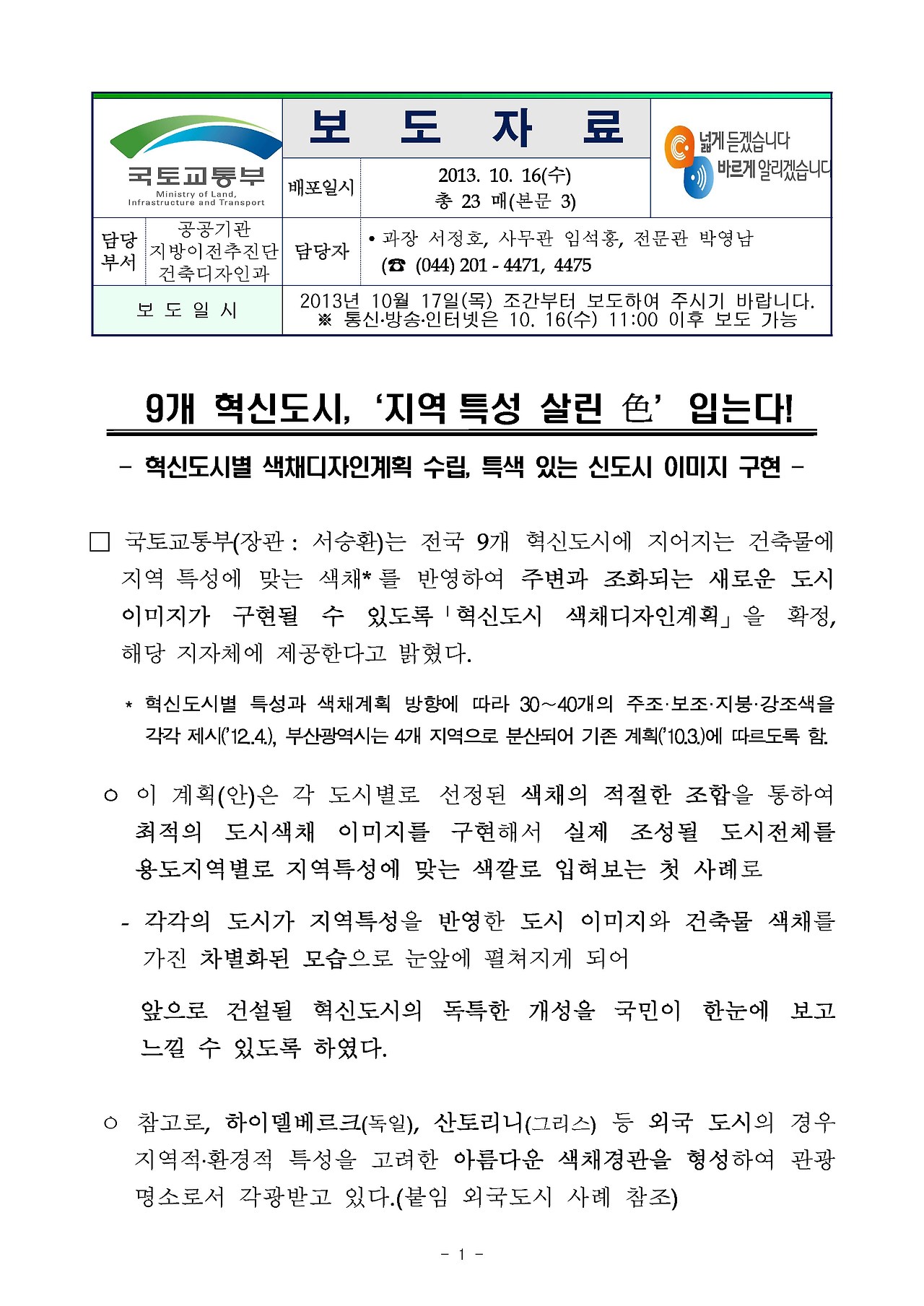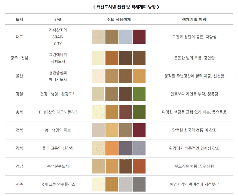 사례를 하나 들어 본다. 지난 2013년 10월 17일, 국토교통부는 혁신도시 색채디자인계획(참고)을 발표했다. "전국 9개 혁신도시에 지어지는 건축물에 지역 특성에 맞는 색채를 반영하여" 해당 도시를 독일의 하이델베르크, 그리스 산토리니 등의 외국 도시처럼 아름답게 만들겠다는 것이었다. 비록 이 계획이 '권고'의 효력을 가진다는 다행스러운 사실에도 불구하고, 인위적으로 색을 정해 도시를 치장하고 또 서로를 구분하겠다는 생각은 '혁신도시'와 거리가 멀어 보인다.(그림 1)