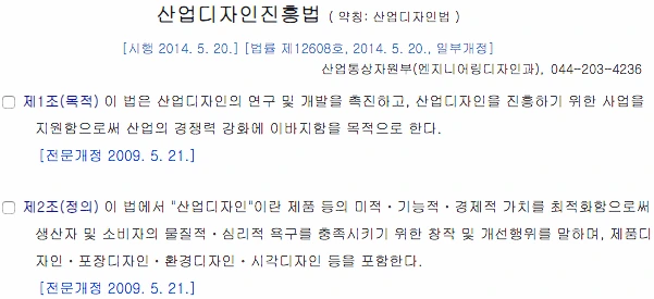 디자인보호법도 유사하다.(그림 5) 제1조와 2조에 따르면, 이 법은 "산업발전에 이바지"할 것을 목적으로 제정되었으며, 디자인을 "물품(및 글자체)"에 한정해 정의하고 있다.