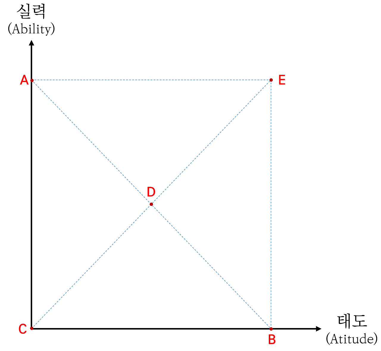 - 보통의 직장인들은 선분AB 위에 있을 것입니다. 그 균형을 지키는 사람이 D가 될 것입니다. 이 사람은 실력도 보통이고 태도도 보통인 사람이지요. (선분AD 상에 있는 사람은 실력은 우수하지만 태도가 다소 부족한 사람, 선분BD 상에 있는 사람은 태도는 우수하나 실력이 다소 부족한 사람입니다)