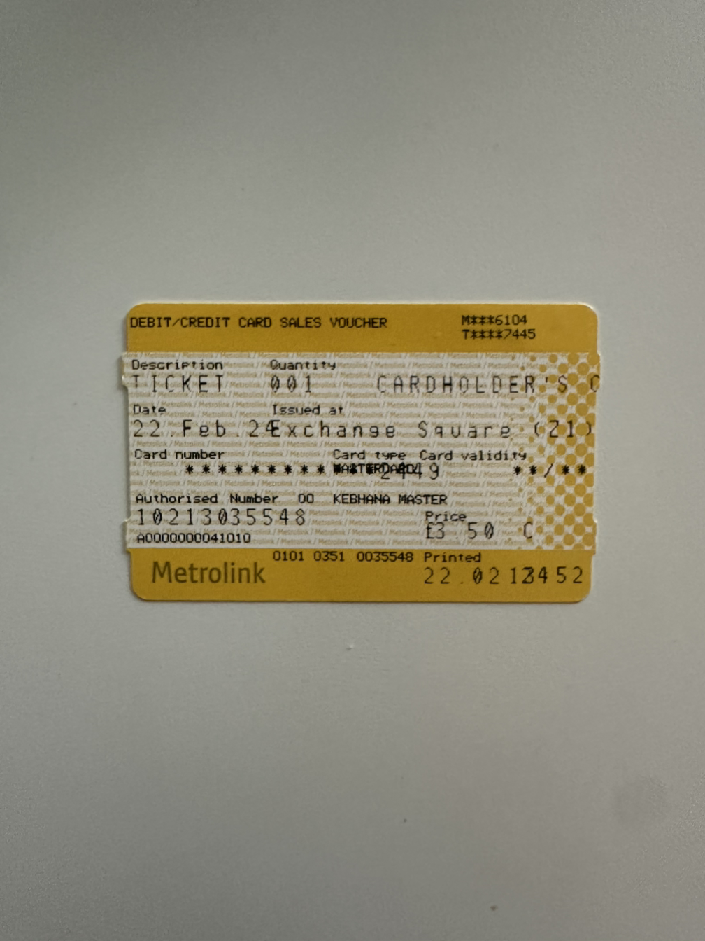 올드 트래포드에 가기 위해서는 메트로링크(트램)를 탑승해야 한다. 왕복 3.5 파운드 가격의 티켓을 결제하면 자동 발매기에서 노란색 티켓 2장이 나온다. 이곳은 특이하게도 역무원이 없기 때문에 티켓을 끊는 것은 양심의 영역이다. 갑작스럽게 등장하는 표 검사원만 없다면 이론상 공짜로 트램을 탈 수 있다. 하지만 단돈 3.2 파운드에 스스로에게 부끄러운 짓은 할 수 없으리라… 필자가 트램을 탄 날에는 야광 노란색의 조끼를 걸친 덥수룩한 수염이 도드라지는 표 검사원이 나타났다. 우리는 표를 끊고 탑승했기에 문제없이 올드 트래포드로 갈 수 있었지만, 다른 칸에 탔던 현지인으로 추정되는 청년들은 다음 역에 내려 표를 끊고 다음 트램을 탔어야 했을 것이다.