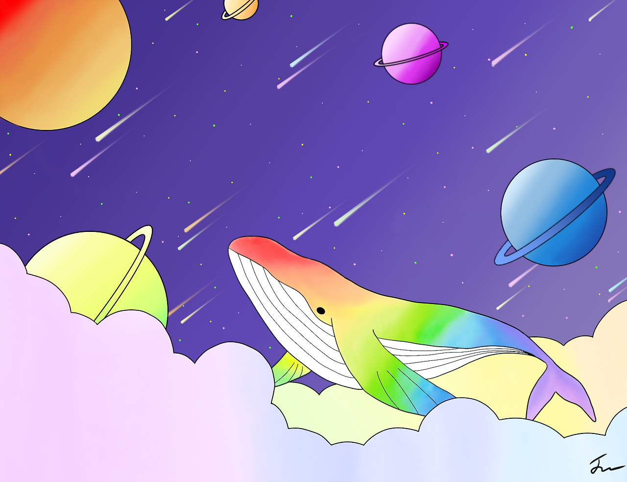 우주를 날아다니는 무지개 고래를 보면서 반복되는 일상을 피해 당신의 상상력을 자극해보세요.