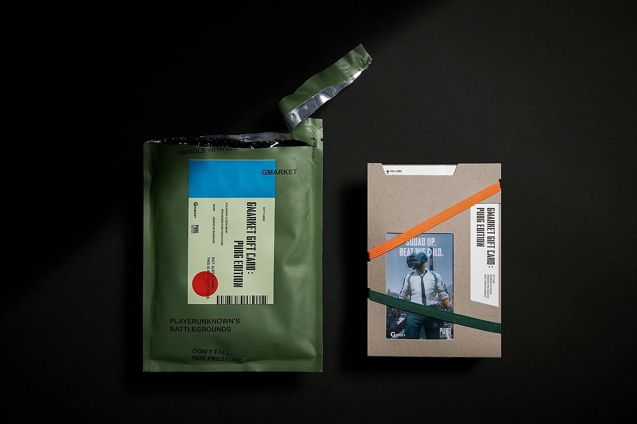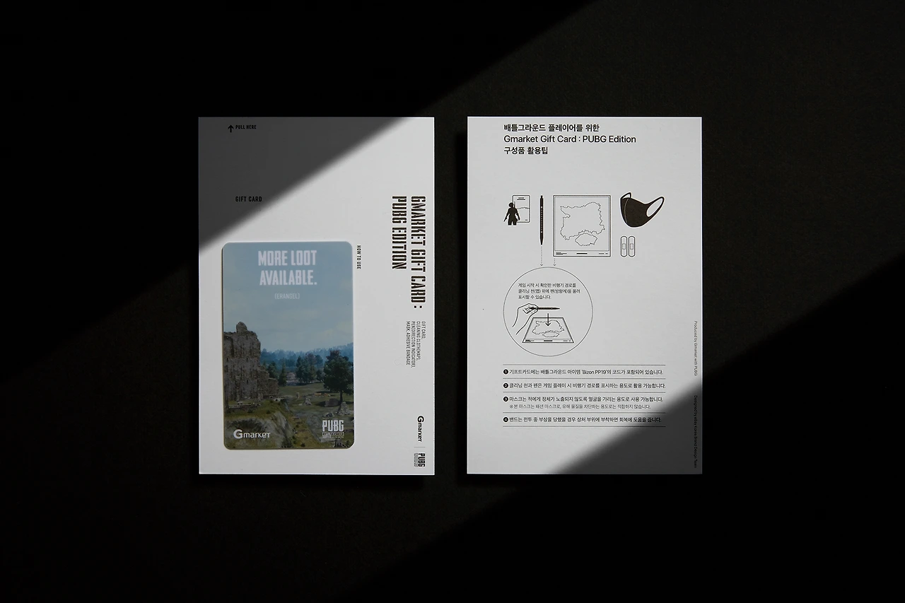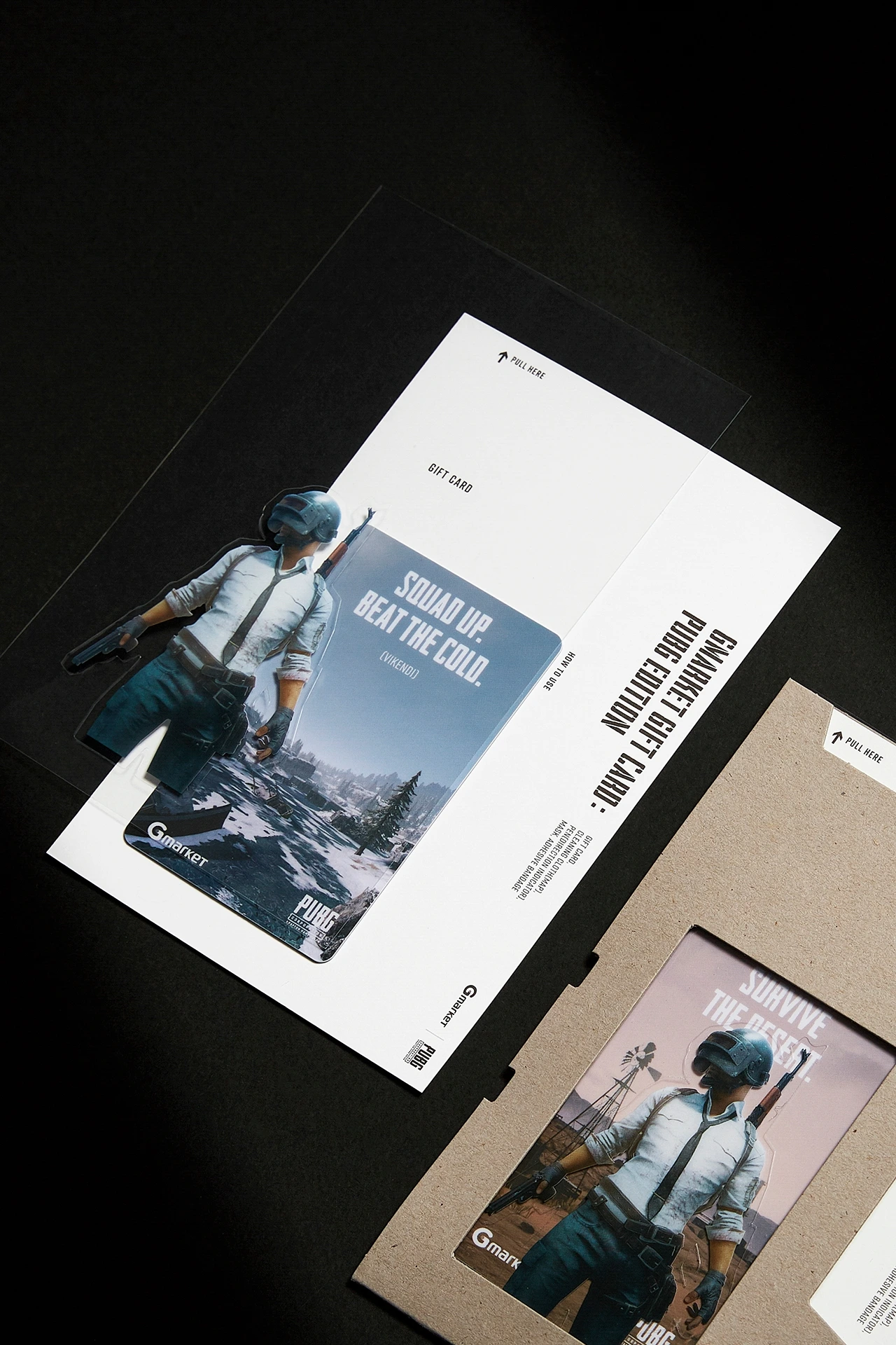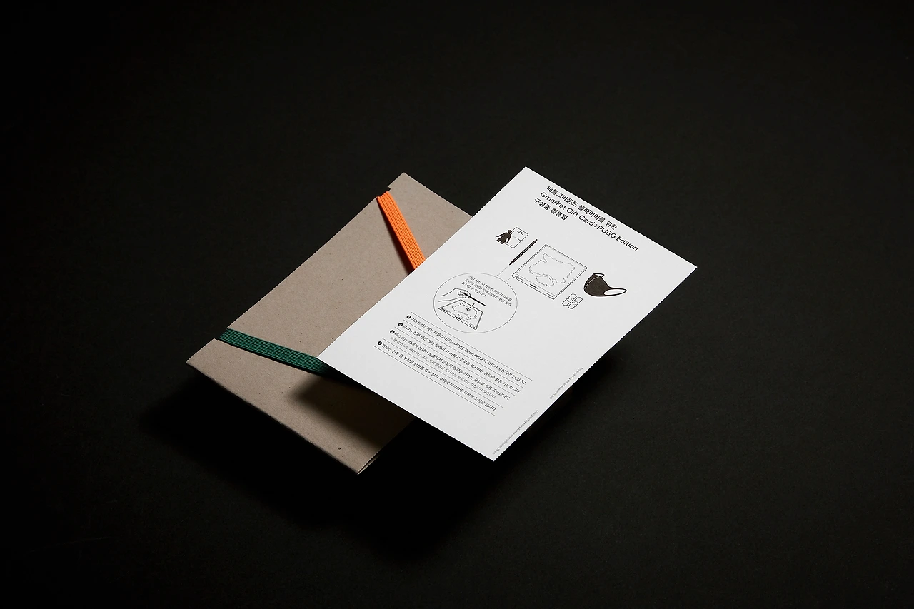 (배틀그라운드 유저들만 알 수 있는 외형의) 봉투 비닐을 뜯고, 러프한 느낌의 종이를 만지고, 탄성이 있는 고무 밴드를 벗기고, Half Glossy한 종이에서 글로시한 플라스틱 소재 카드를 꺼내는 Unpacking경험을 설계했다.