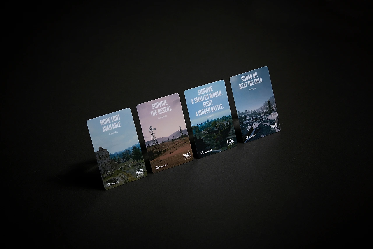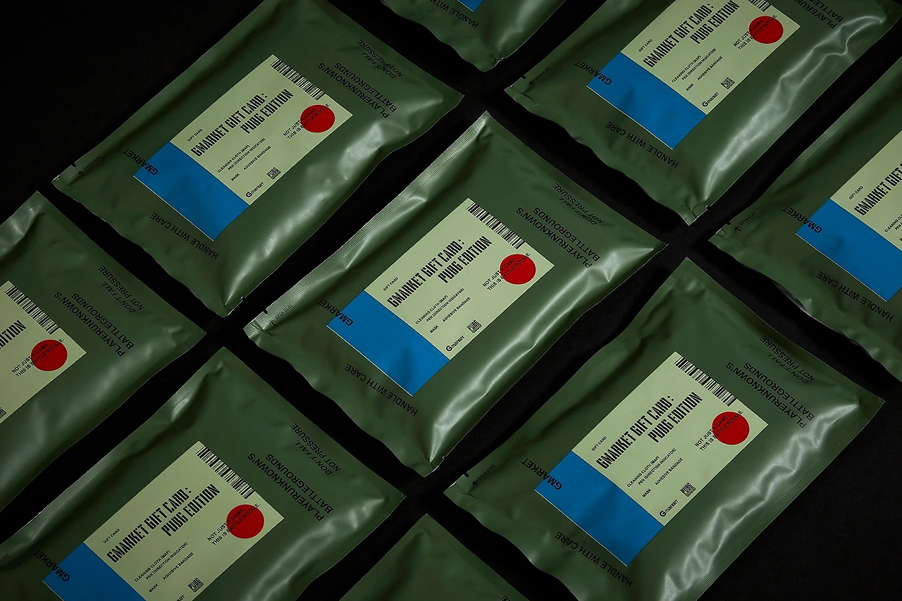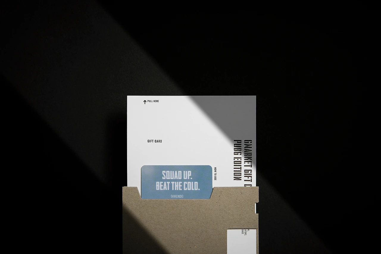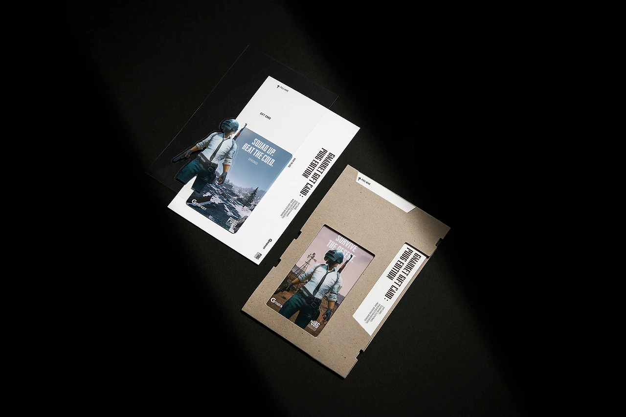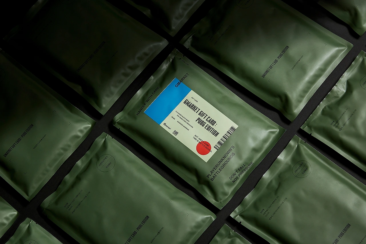(배틀그라운드 유저들만 알 수 있는 외형의) 봉투 비닐을 뜯고, 러프한 느낌의 종이를 만지고, 탄성이 있는 고무 밴드를 벗기고, Half Glossy한 종이에서 글로시한 플라스틱 소재 카드를 꺼내는 Unpacking경험을 설계했다.
