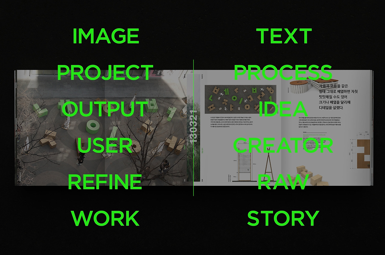 책을 꺼내게 되면 '이 책을 어떻게 봐야 하지?' 하는 고민부터 들게 된다. 친절한 설명이나 장치가 없다. 사실 이 책은 어떻게 봐도 상관없는 구조다. 책을 읽는 사람에게도, 보든 사람에게도 일단 책이 내 앞에 있다면 어떻게 사용해도 좋다. 프로젝트 면을 가볍게 보는 것도, 조금 더 깊게 프로세스 면을 읽는 것도, 전체를 비교하면서 동시에 읽는 것도 가능하다. 펼쳐서 두 권으로 읽는 것도 중간을 반을 접어서 한 권으로 읽는 것도 가능하다. 모든 것이 열려있기에 오히려 "어?" 하며 시작되는 낯설음이 있다. 그 경험을 의도해 책에 대한 설명을 넣지 않았다.