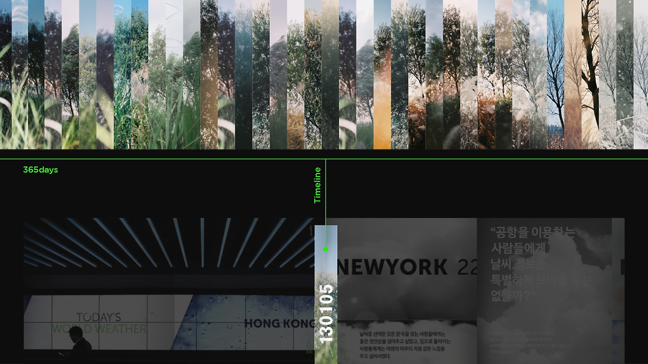 이 두 권의 책은 서로 한 권으로 연결되어 책을 펼치면 마주 보는 구조를 취한다. 이는 프로젝트와 진행 과정에 숨은 이야기를 함께 들려주고자 하는 의도가 담겨있다. 시간의 흐름에 따라 4페이지의 이야기가 양쪽으로 펼쳐진다. 책의 중앙에는 한그루의 나무가 시간의 흐름에 따라 비를 맞고 눈을 맞으며 조금씩 자란다. 매일 한강에서 같은 나무를 찍는 프로젝트를 진행 중이던 표기식 작가님을 사진을 사용했다. 시간성을 가지고 조금씩 변하는 나무의 이미지는 책의 콘셉트를 끌고 가는데 큰 역할을 했다.