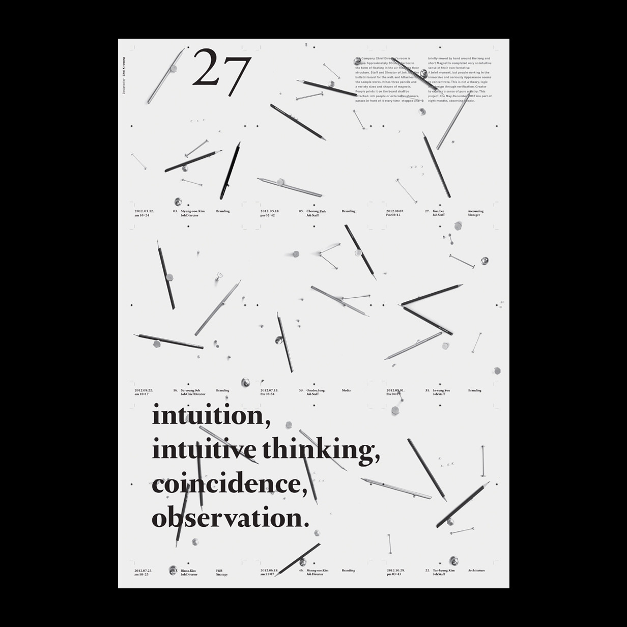 일로서 누군가를 설득하기 위한 이유 있는 디자인, 관계, 맥락, 논리, 분석, 데이터 등 다소 딱딱하고 이성적인 내용들을 고민하다 보면, 가끔은 일로서의 디자인이 아닌 한 명의 창작자로서 논리, 이성적인 것들을 덜어낸 작업을 동경하고 순수하게 본능적이고 감각(직관)에 의존한 디자인이란 어떤 것일까를 고민하곤 한다. 어찌 보면 짧은 순간 목적 없이 발생한 이런 행동과 행동의 결과가 순수한 직관에 의한 조형이지 않을까? 하는 생각이었다. 나는 이것들을 한데 모아 포스터로 만들었다.