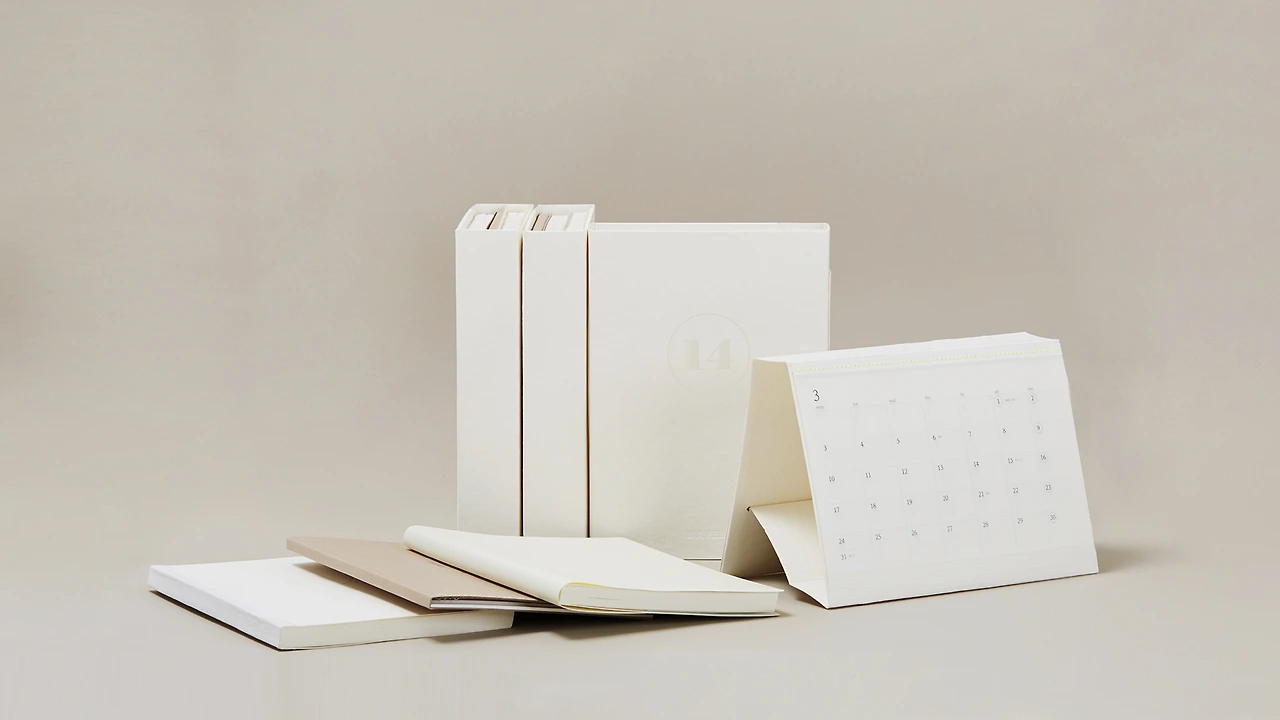 세트는 다이어리, 노트, 메모패드로 구성되고 스테이셔너리 케이스는 옆면을 뜯어 반대쪽으로 접으면 쉽게 탁상용 캘린더로 재 사용할 수 있는 지기로 만들었습니다. 슬리브 형태의 패킹이라 구성품이 흘러내리지 않도록 사이즈의 미세한 디테일과 구성품 간 마찰력을 만들어내는 테스트를 수차례 진행해서 자연스러운 언팩킹 경험을 유도했습니다.