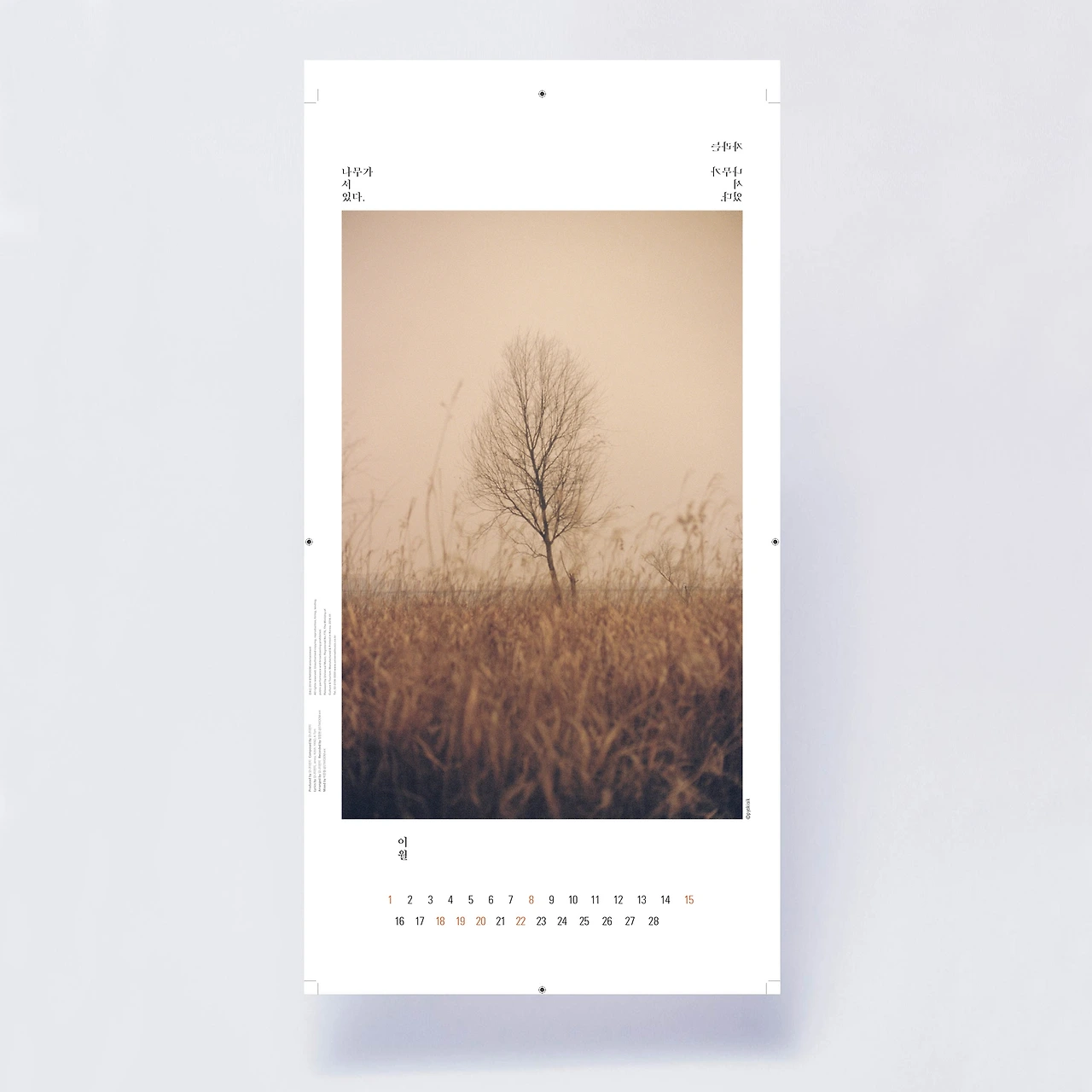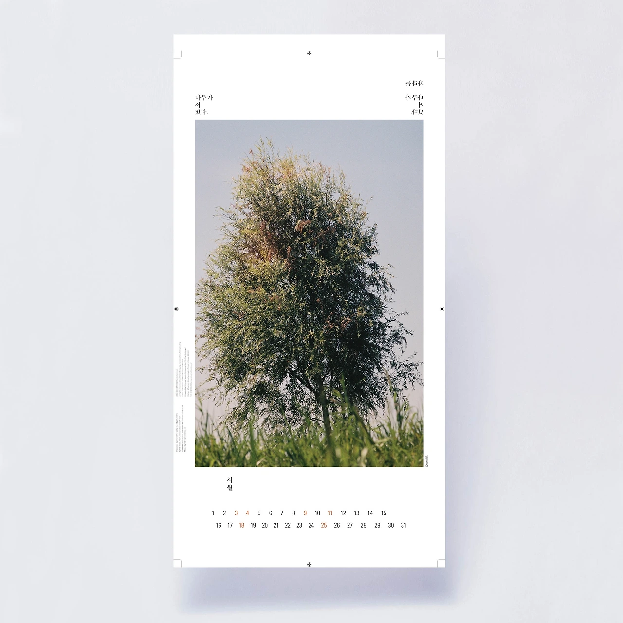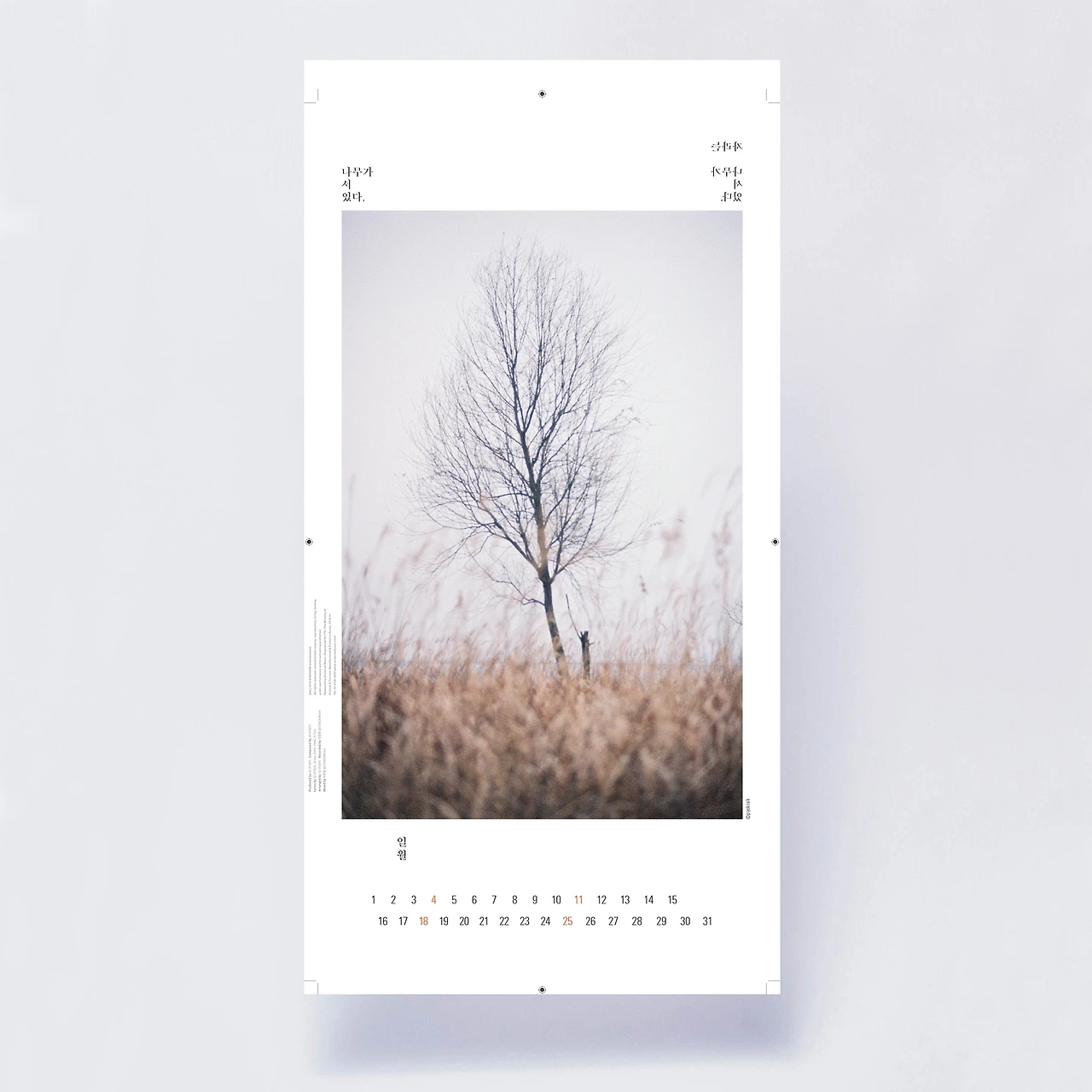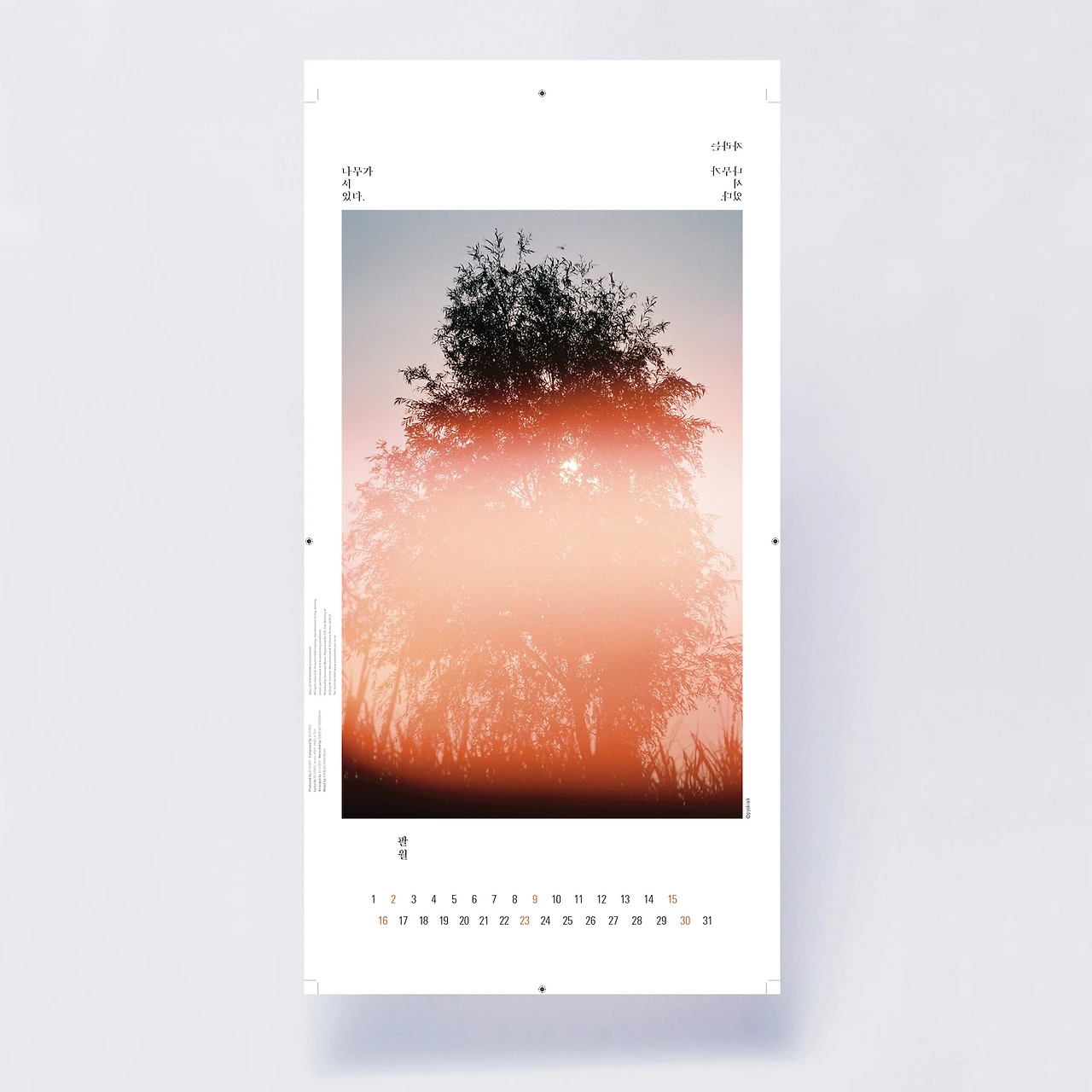 프로젝트를 잘 마치고 얼마 지나, 찍어둔 나무 사진으로 달력을 만드려고 하는데 내가 디자인을 도와주었으면 좋겠다 하여 기꺼이 하겠다했다. 시간의 순간을 담은 사진이라 생각했기 때문에 달력이라는 것이 묘하게 잘 어울린다고 생각했다.