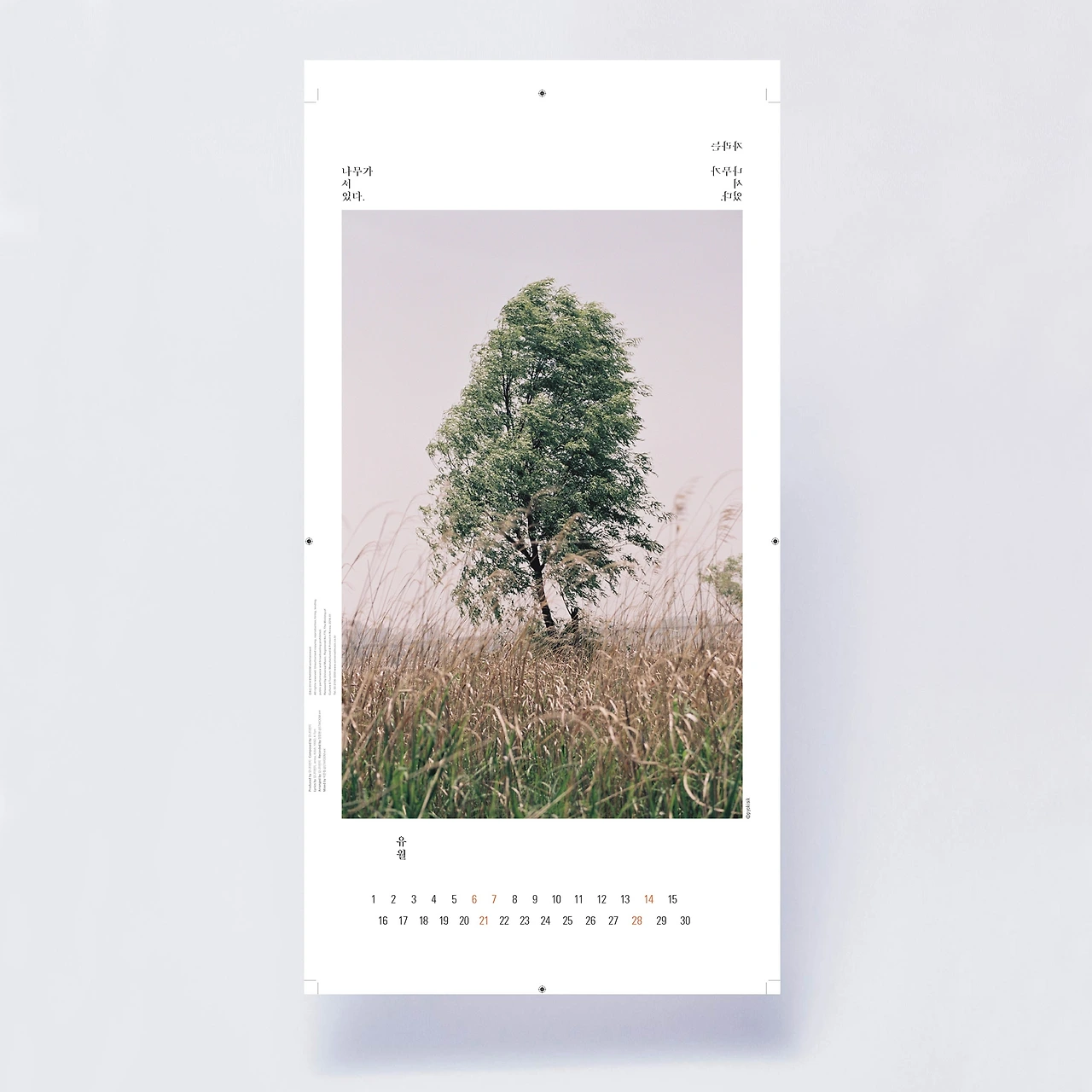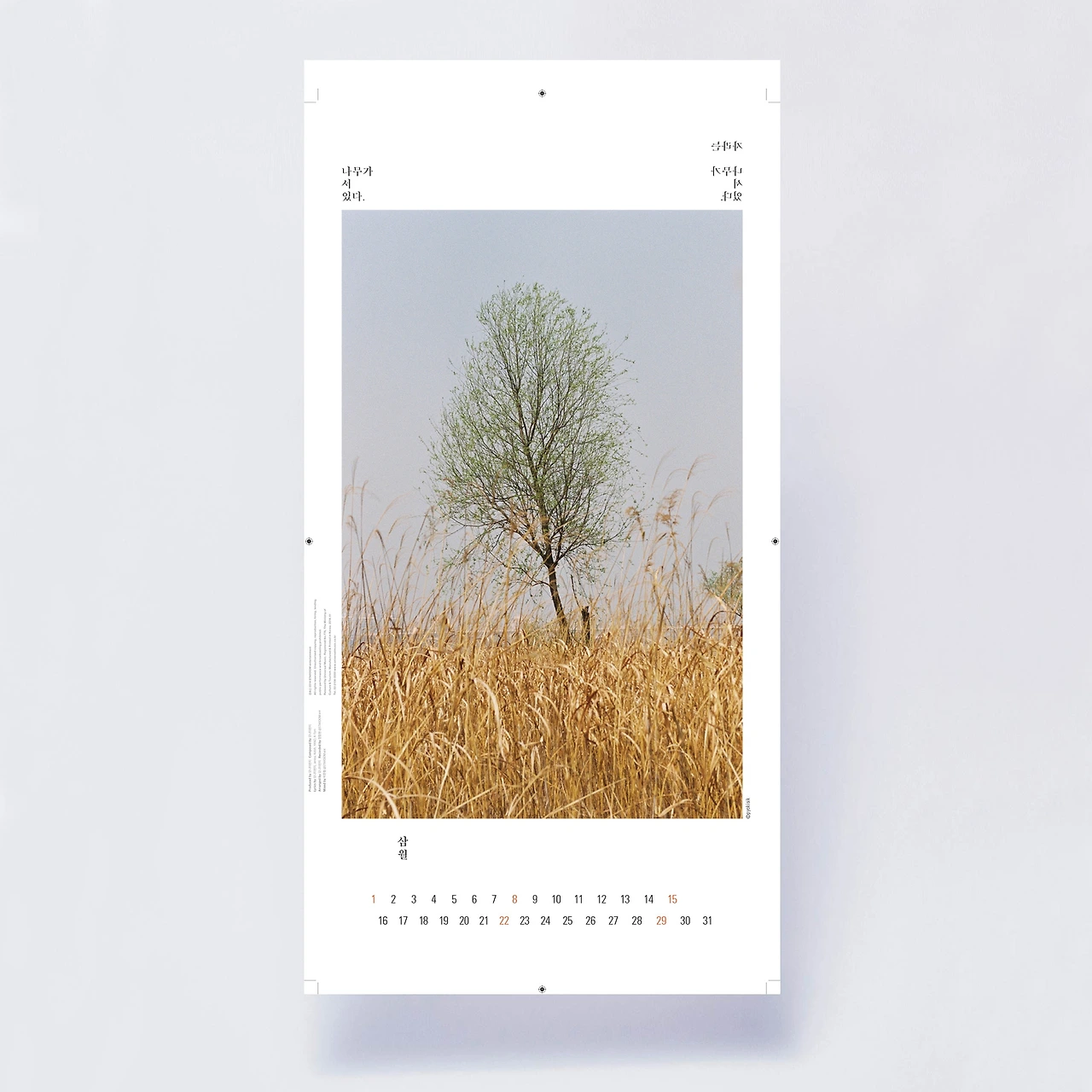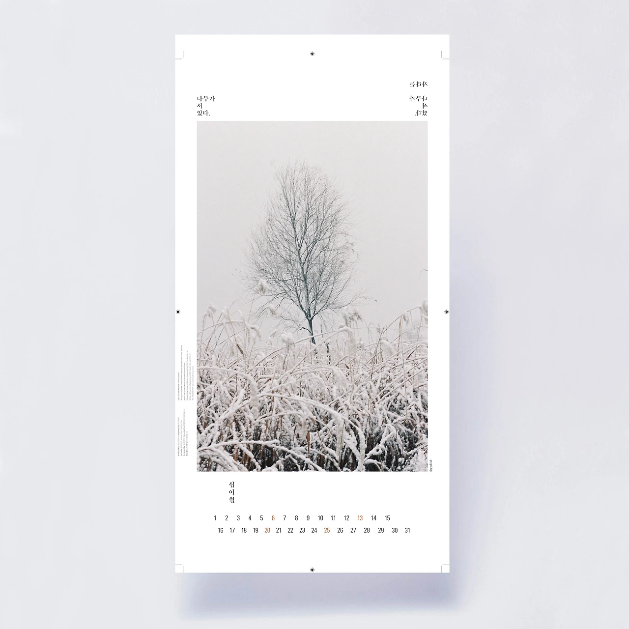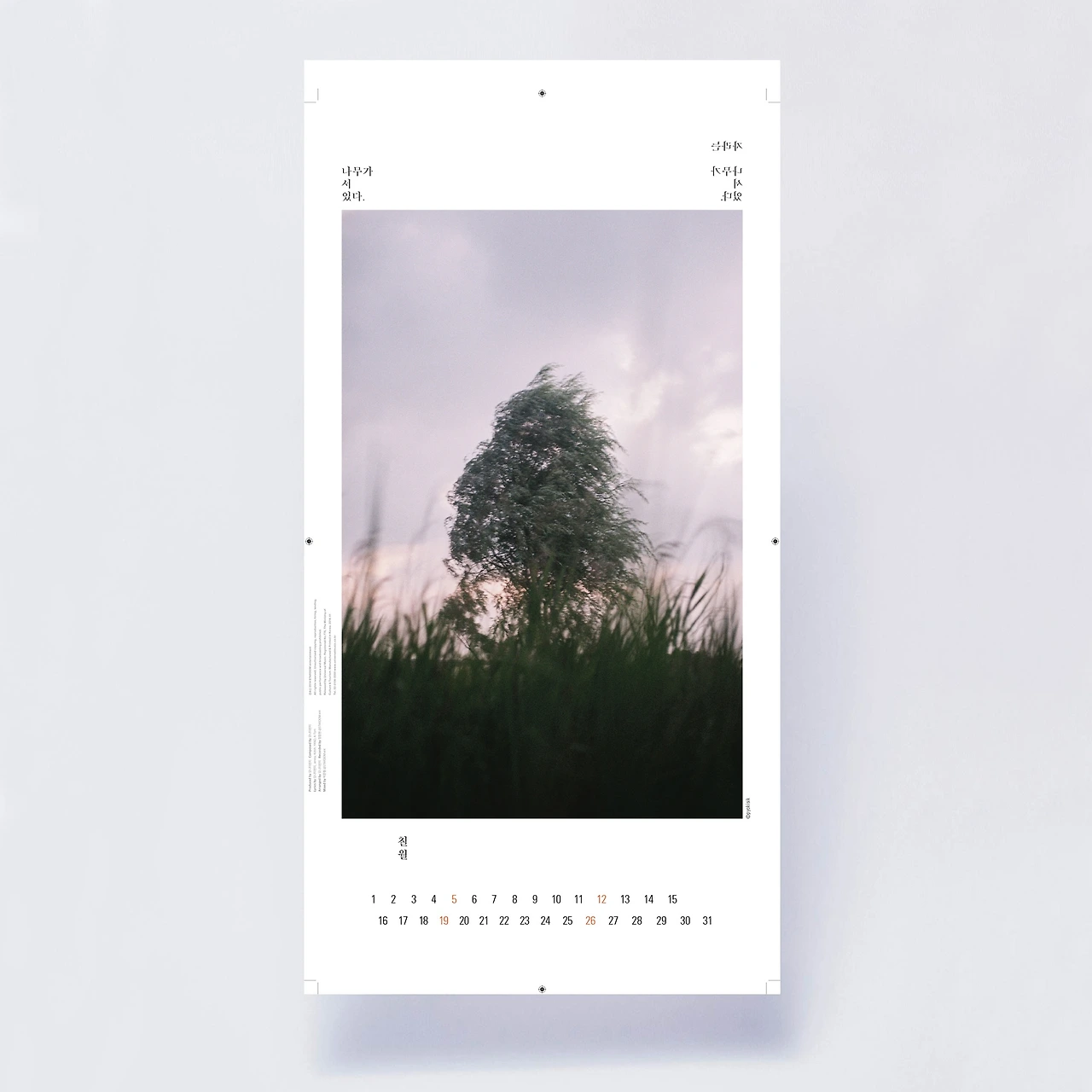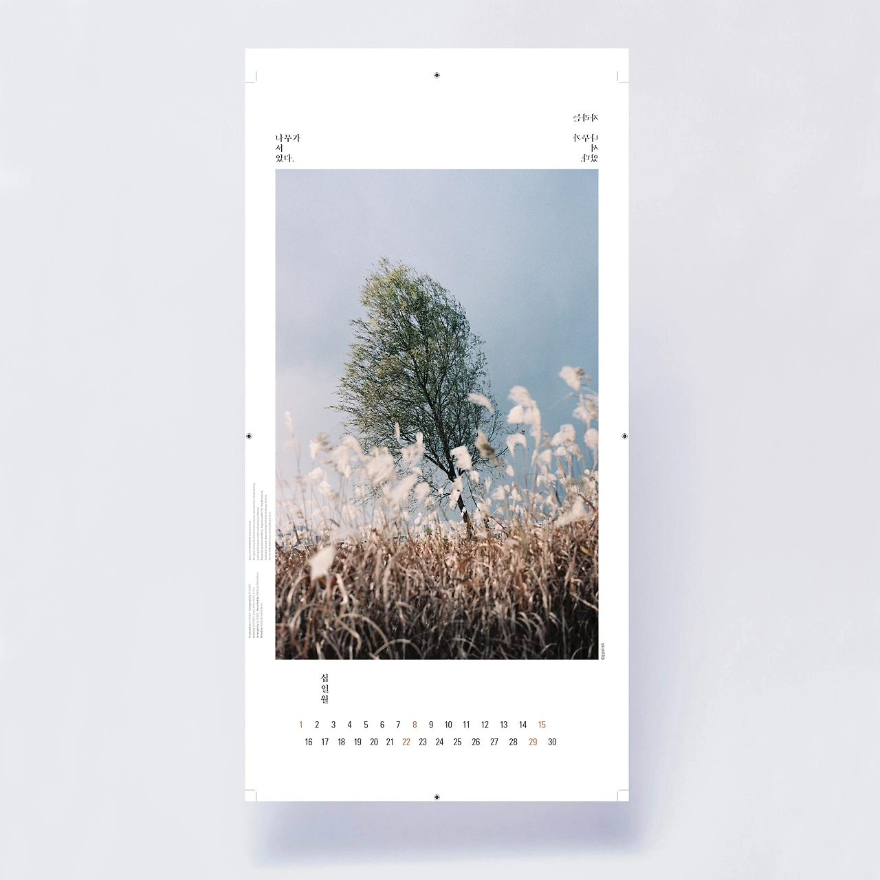 프로젝트를 잘 마치고 얼마 지나, 찍어둔 나무 사진으로 달력을 만드려고 하는데 내가 디자인을 도와주었으면 좋겠다 하여 기꺼이 하겠다했다. 시간의 순간을 담은 사진이라 생각했기 때문에 달력이라는 것이 묘하게 잘 어울린다고 생각했다.