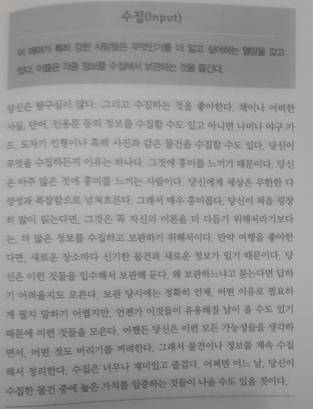1. 무엇인가를 더 알고 싶어한다. 2. 정보를 수집해서 보관하는 것을 즐긴다.
