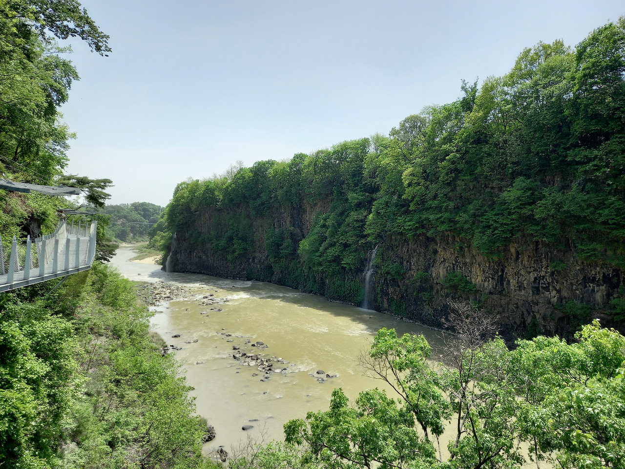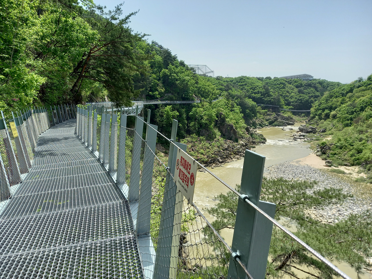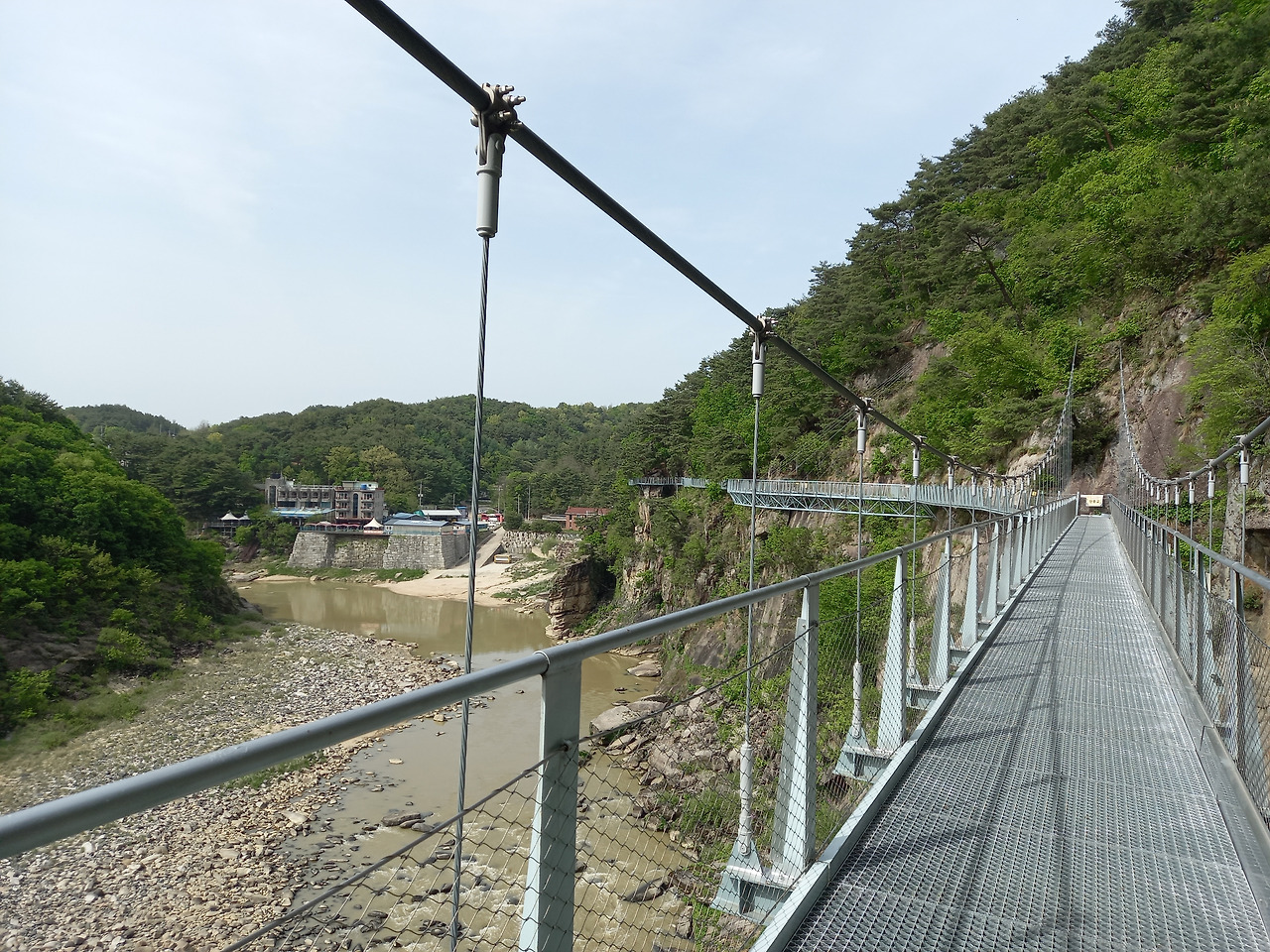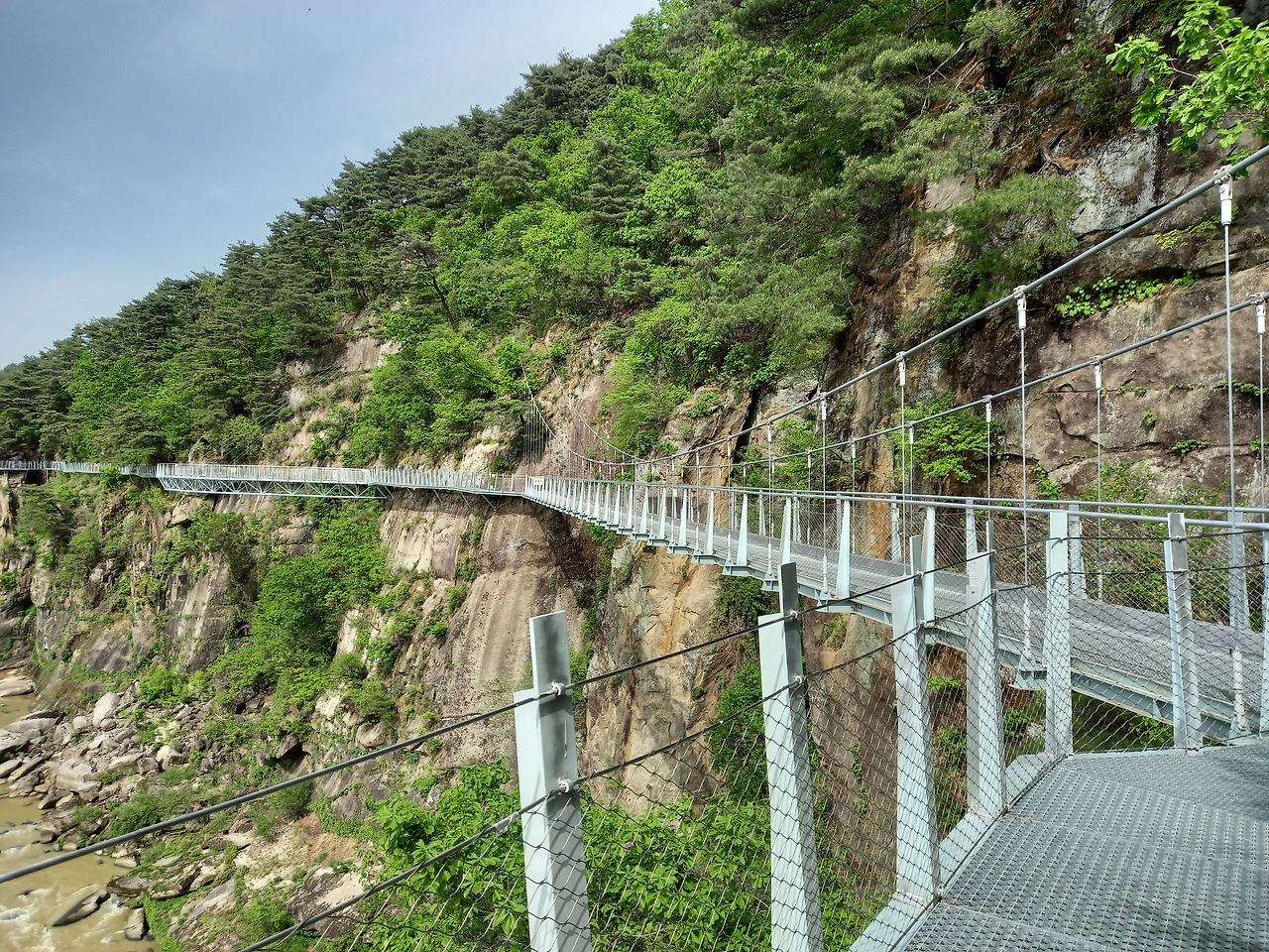 산허리를 따라 설치된 잔도 위로 첫 발을 내딛는데 발아래로 한탄강이 흐르고 사람의 손을 전혀 타지 않은 날것 그대로의 자연이 반겨주었다. 중간중간에는 밑이 훤히 내려 보이는 유리바닥에서 쬐끔(?) 스릴을 느끼게 하는 스카이워크를 조성해 놓았다. 시원한 바람이 불어오고 달콤한 풀 내음이 코끝을 스치니 온몸의 세포가 깨어나고 정화되는 느낌이었다. 처음에는 그랬다~ ㅋ