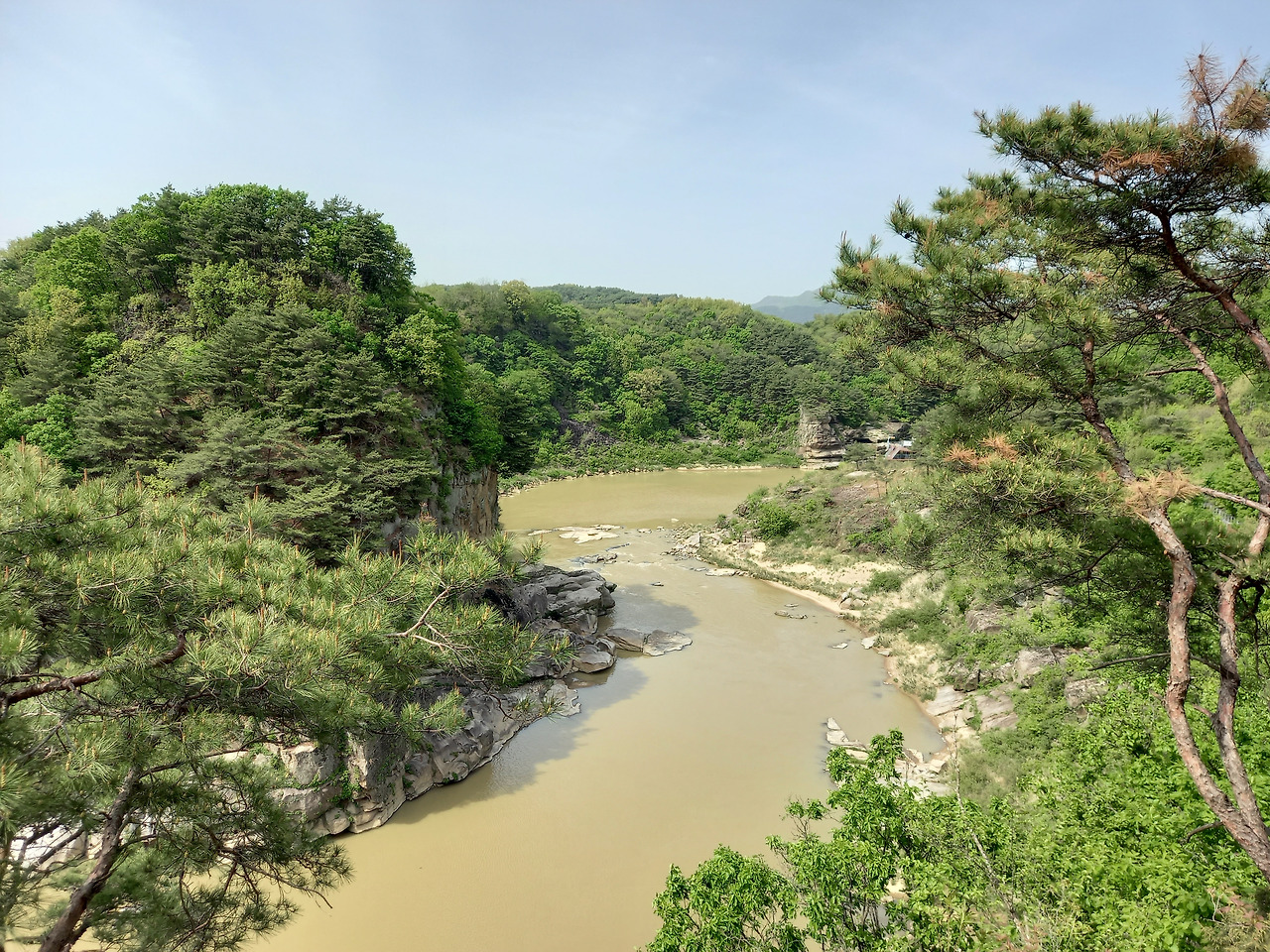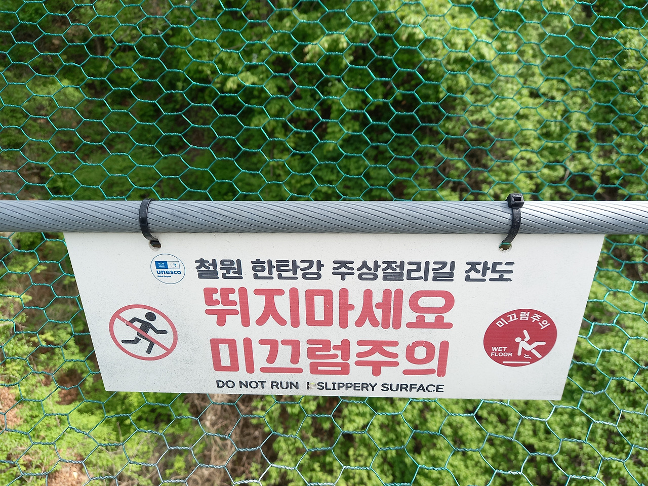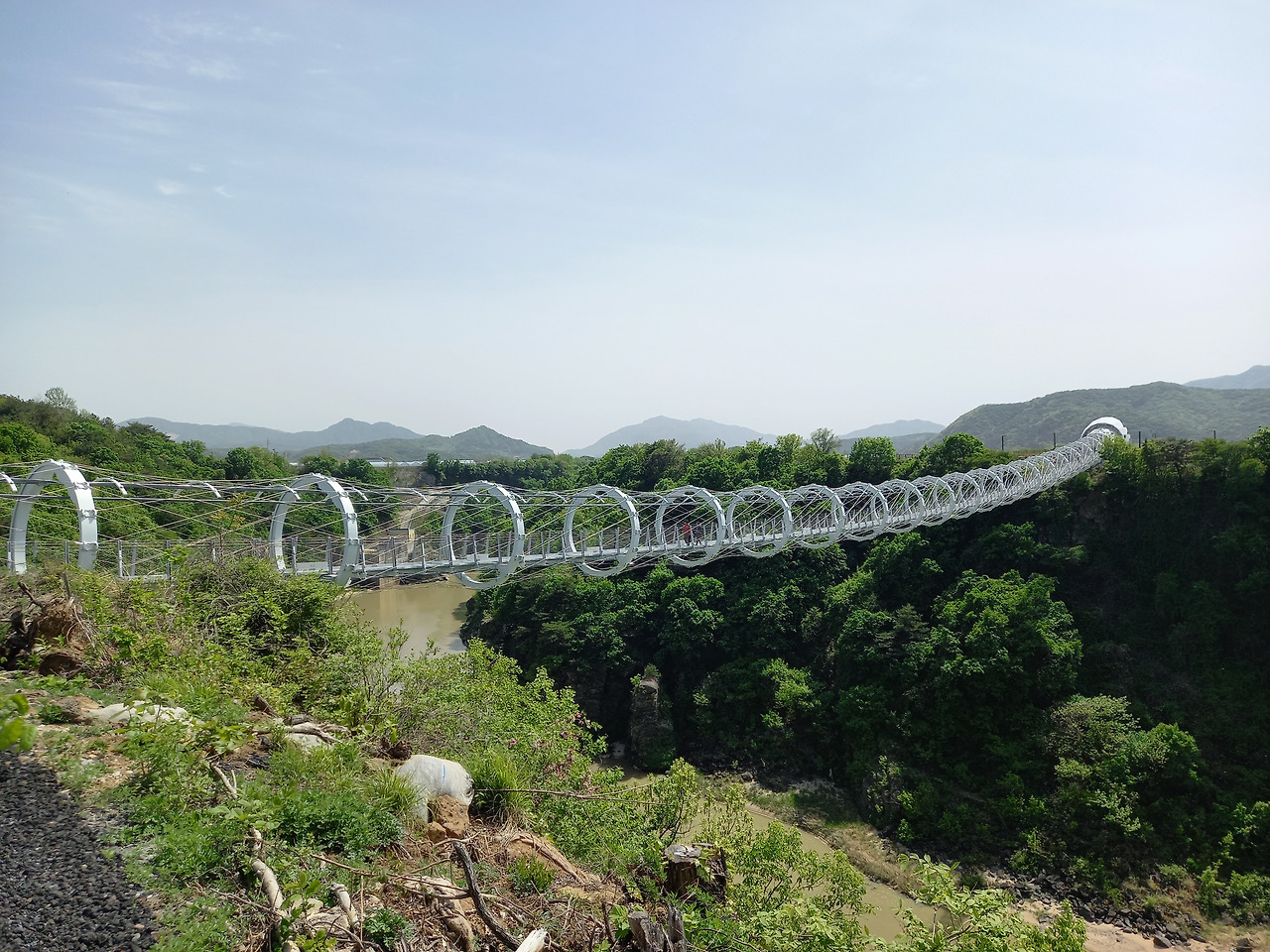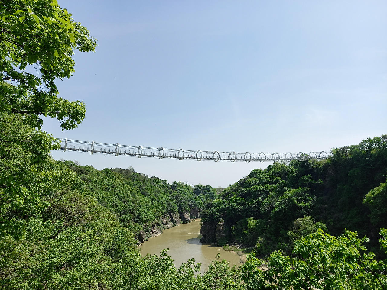 산허리를 따라 설치된 잔도 위로 첫 발을 내딛는데 발아래로 한탄강이 흐르고 사람의 손을 전혀 타지 않은 날것 그대로의 자연이 반겨주었다. 중간중간에는 밑이 훤히 내려 보이는 유리바닥에서 쬐끔(?) 스릴을 느끼게 하는 스카이워크를 조성해 놓았다. 시원한 바람이 불어오고 달콤한 풀 내음이 코끝을 스치니 온몸의 세포가 깨어나고 정화되는 느낌이었다. 처음에는 그랬다~ ㅋ