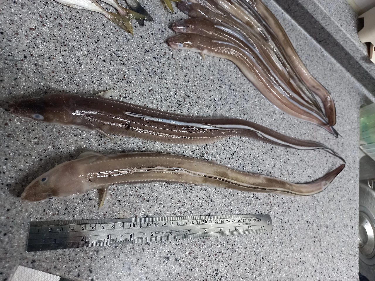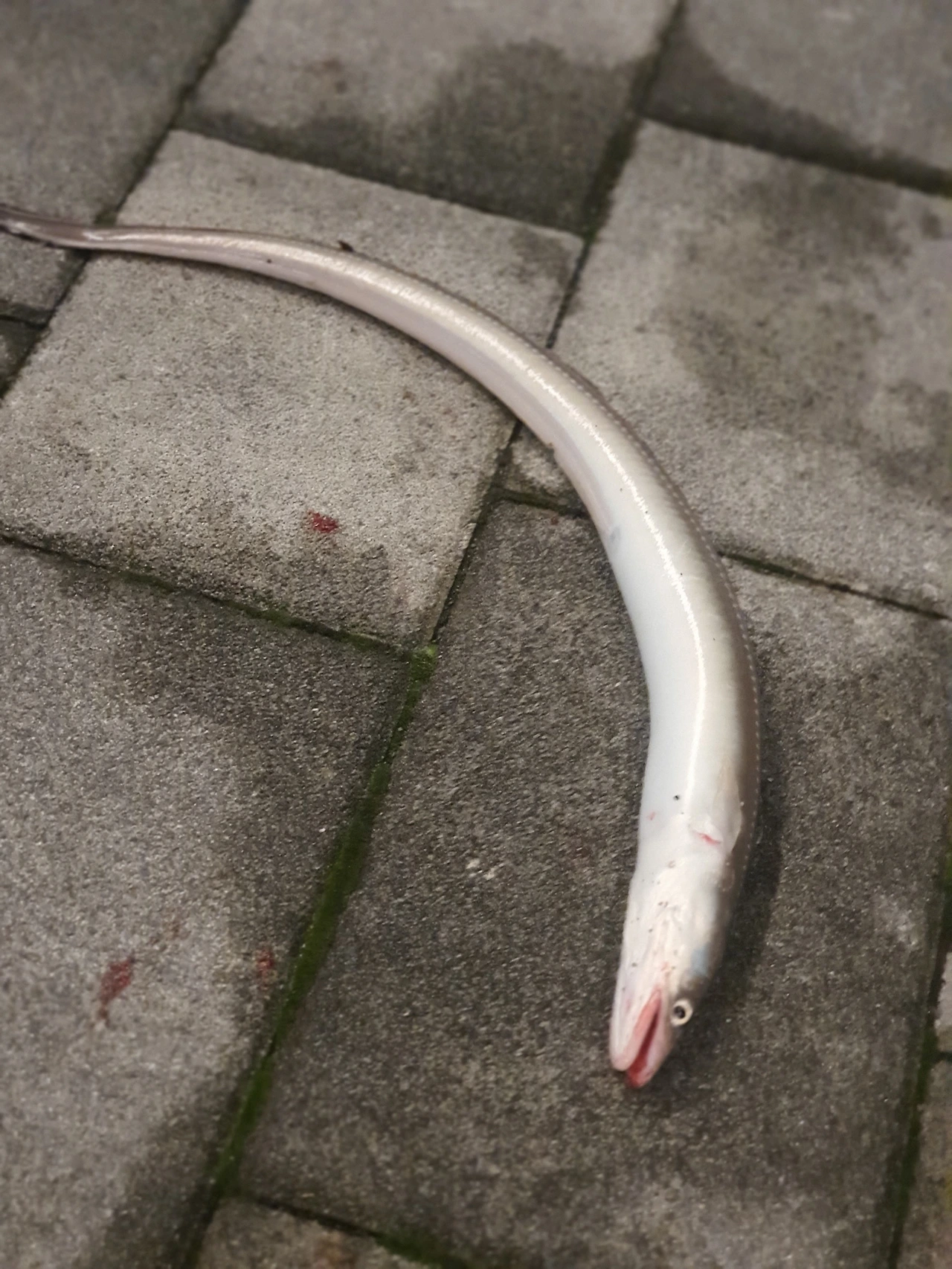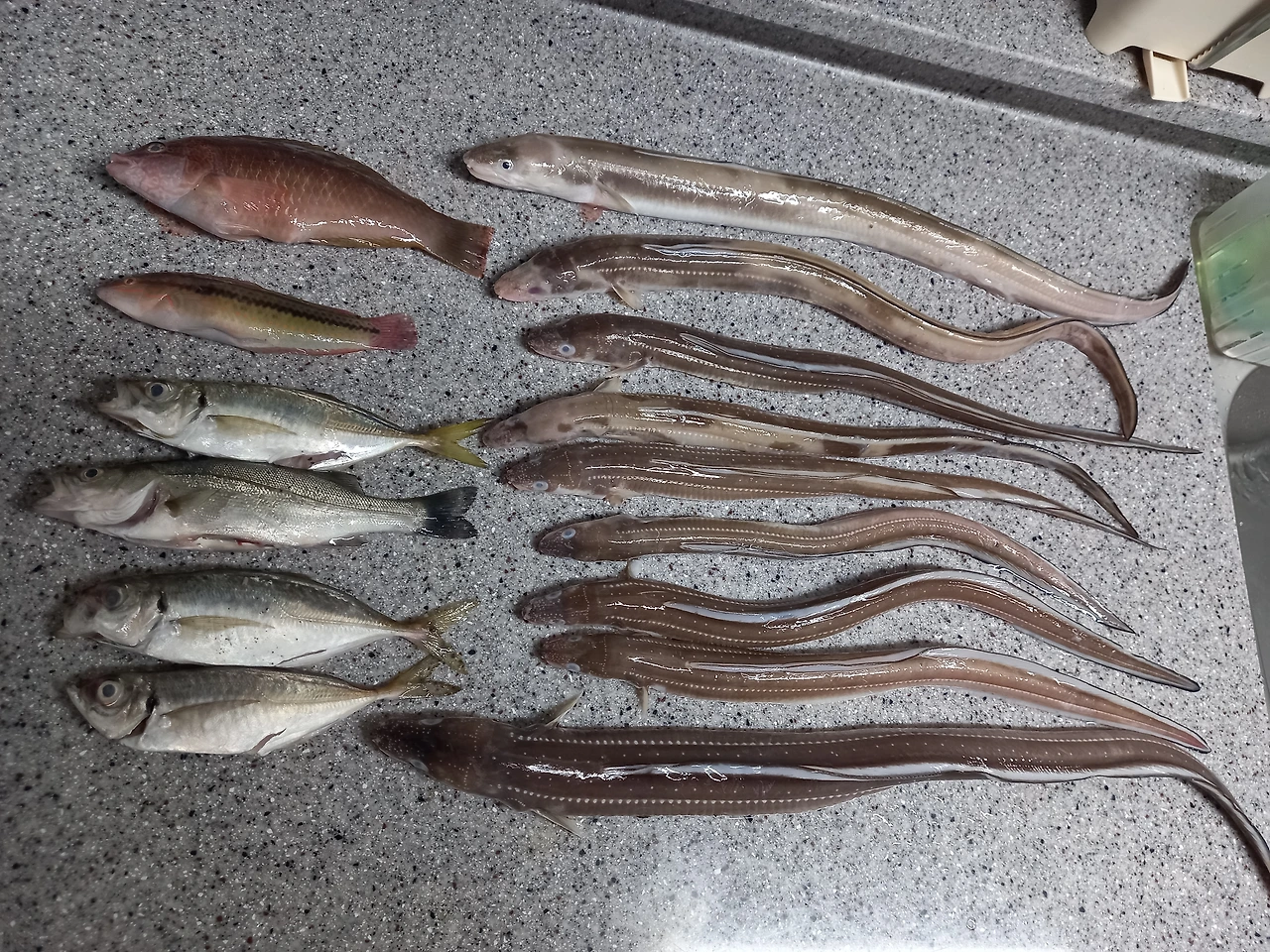 잠시 후 원투대에서 입질이 오더니 힘이 좋은 바닷장어('붕장어' 또는 '아나고'라고도 불림)가 잡혀 올라왔다. 그 후로도 계속 장어만 올라와 작은 것은 살려주고 큰 놈만 7~8마리 남겨놓았다. 아내는 옆에서 찌낚시로 큼지막한 노래미 한 마리를 잡아 올렸다. 작년에는 아주 씨알이 좋은 장어를 한 마리 잡아서 낚시하던 다른 현지인에게 줘버렸는데 올해는 무조건 다 가지고 가서 어떻게든 손질을 해 볼 요량으로 모두 아이스박스에 넣어놓았다.
