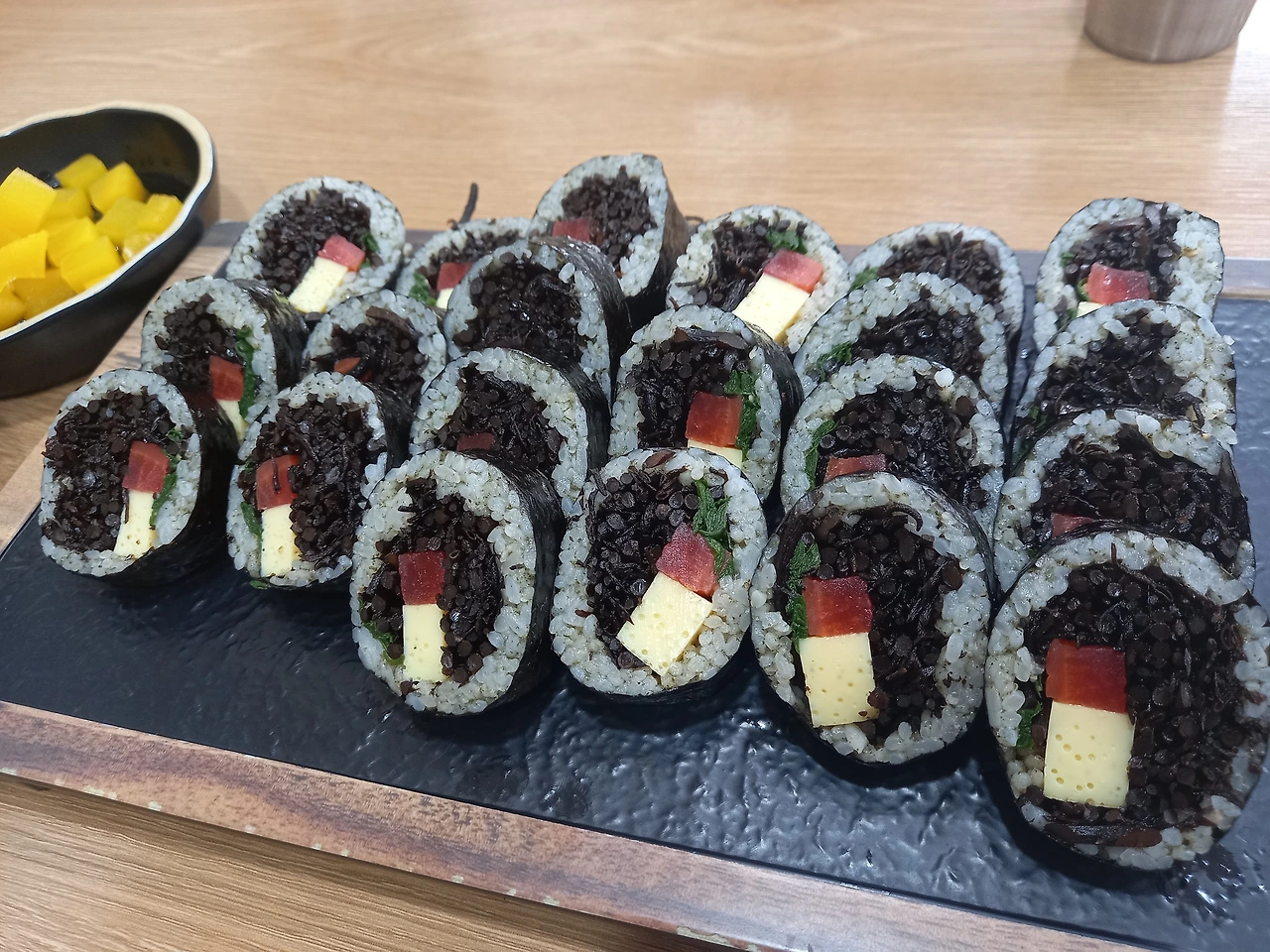 다음날 아침 9시가 훨씬 넘어서 일어나 편의점에 들러 얼음을 사서 물고기를 넣어놓은 아이스박스에 가득 채웠다. 하루를 더 있어야 하니 물고기가 상하지 않도록 최대한 온도를 낮추어 보관해야 춘천까지 이상 없이 가져갈 수 있지 않겠는가. 그런 다음 통영의 대표메뉴 중의 하나인 배말칼국수와 톳김밥으로 아점을 먹고 11시 반쯤 다시 낚시 포인트로 이동하여 낚싯대를 드리웠다. 지나고 나서 생각해 보니 밥 먹는 시간을 빼곤 계속 낚시만 했던 것 같다. 미쳤나 봐~ ㅎㅎ