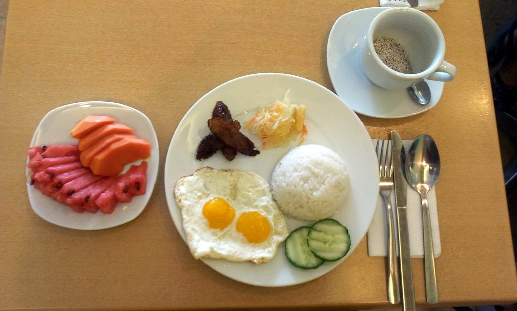 빨간색과 노란색으로 묘하게 조화를 이룬 건물에 들어서니 눈앞에 푸른 바다가 펼쳐져있는 탁 트인 로비가 우리를 맞이한다. 체크인을 하고 방을 들어가 보니 3명이 묵기에는 좀 작아 보였다. 더블룸이라서 Extra Bed를 1개 신청하였는데 도저히 들어갈 공간이 없어 보인다. 그냥 짐을 넣어두고 일단 점심을 먹으러 로비로 내려갔다. 흔히 먹던 필리핀 음식을 시켜 먹고(410페소) 바다를 구경하며 앉아있는데 룸에 들어갔다 나오던 처형이 우리 옆방 손님이 나가서 청소하는 중인데 방이 훨씬 크고 좋다고 한다. 올라가 보니 정말 3명이 쓰기에 딱 좋은 30 스퀘어미터 정도 되는 방이었다. 매니저에게 얘기하여 추가비용을 내고 그 방으로 옮기겠다고 하니 좋단다.