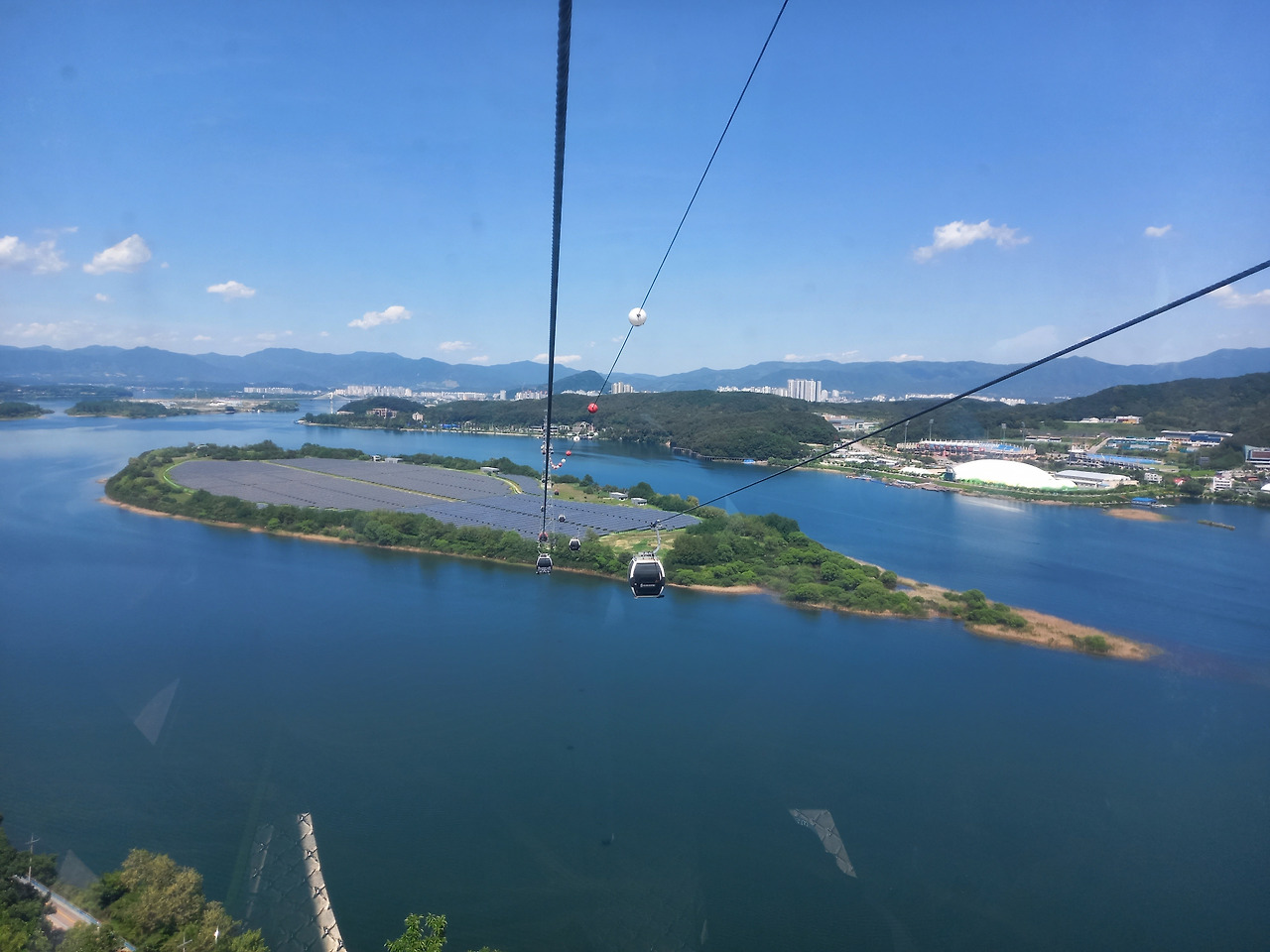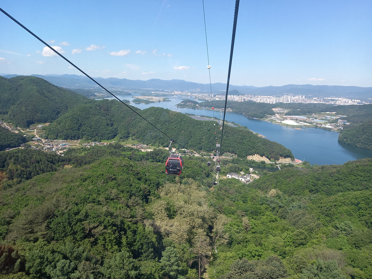 입장권을 끊으려고 매표소 앞에 갔더니 춘천시민은 40%가 할인이 되고 65세 이상은 30%가 할인이 되어 생각보다 저렴한 가격에 구매하게 되었다. 주말이나 휴일에는 관광객들이 너무 많아서 줄을 엄청 길게 서야 하는데 이날은 평일이라서 표를 끊고 바로 탑승할 수 있었다. 케이블카를 타고 올라가는 길에 내려다본 호반의 도시 춘천의 풍경은 그야말로 황홀했다. 아름다운 산과 호수가 푸른 하늘과 어우러진 모습에 눈이 호강하였다. 거의 25분 정도 올라가는 길이 너무 즐겁고 행복했다.