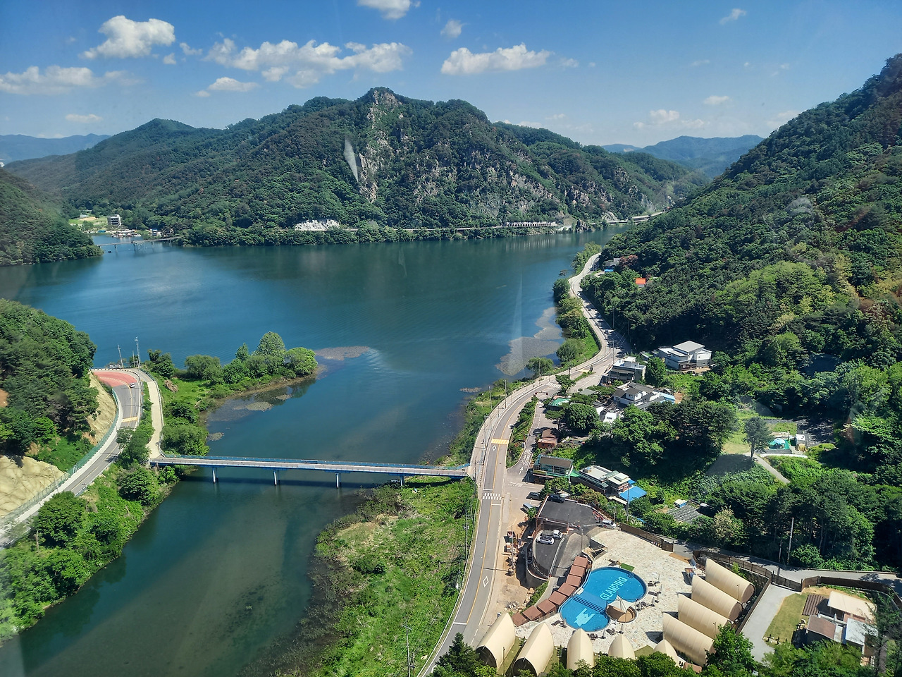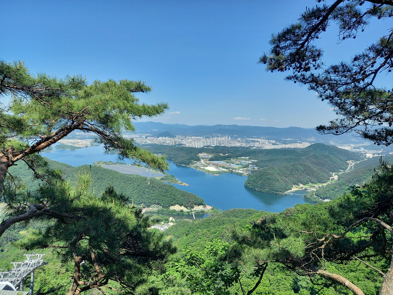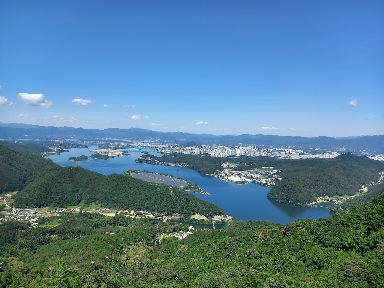 삼악산에 도착하니 다시 전망대로 가는 데크 길이 굽이굽이 놓여있어 15분 정도를 걸어서 여유롭게 올라갔다. 가는 도중에도 발아래 펼쳐진 장관에 연신 카메라를 들이대야 했다. 전망대에서 바닥이 유리로 되어 있는 스카이워크를 한 바퀴 돌고 다시 내려와 카페 앞에 잠시 앉아서 숨을 고른 후 케이블카를 타고 승강장으로 내려왔다.