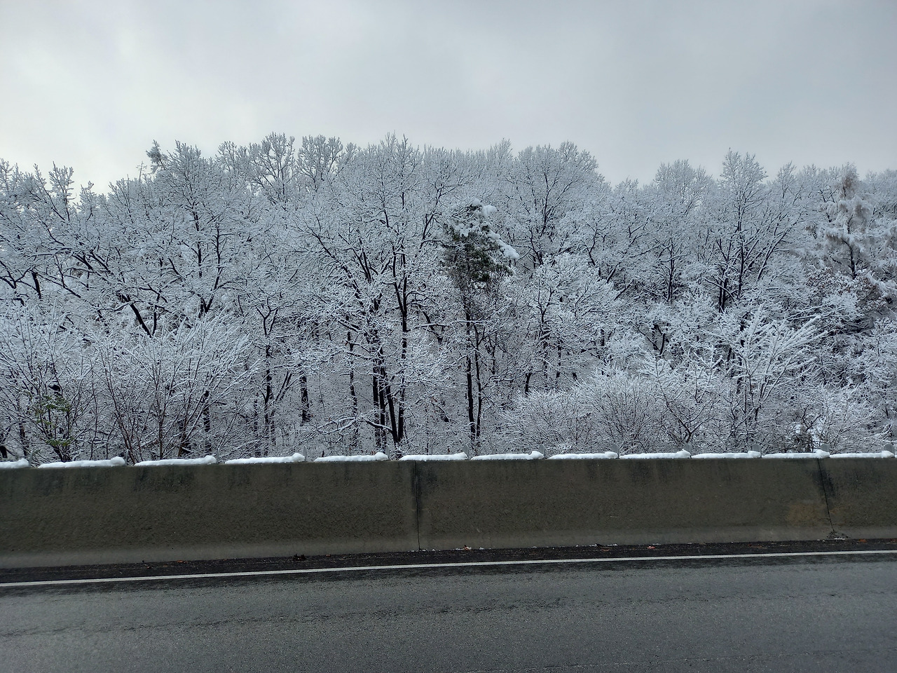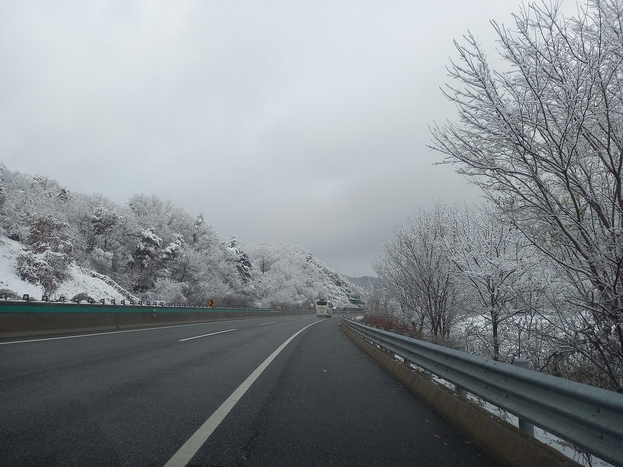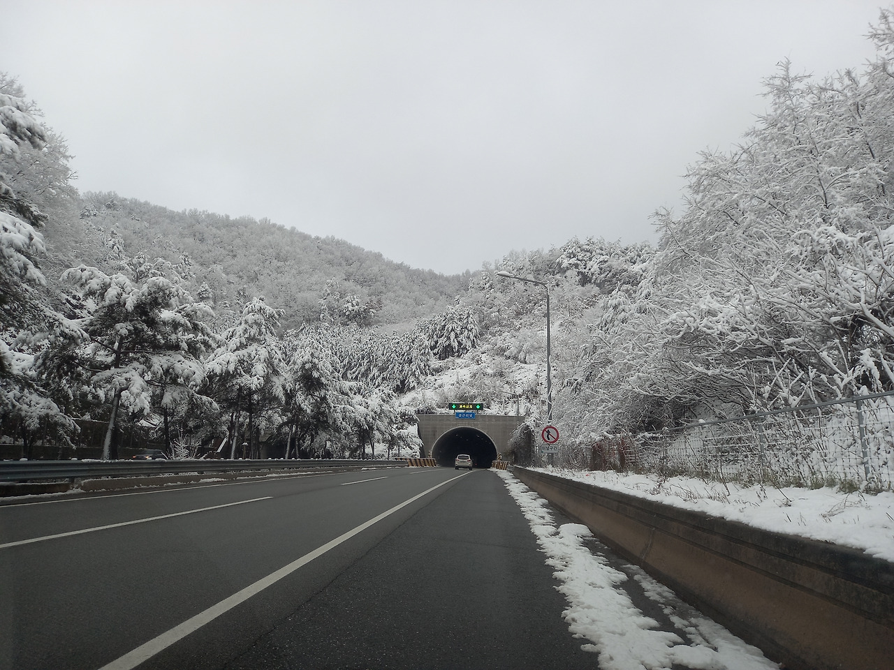 전라도와 경상도를 지날 때까지는 파란 하늘에 햇살도 쨍쨍 비추었는데 충청도를 지나자 갑자기 날씨가 돌변하더니 강원도로 접어들자 폭설이 내리기 시작하였다. 온 세상이 하얗게 변하여 완전 겨울의 한가운데에 있는 기분이 들었다.