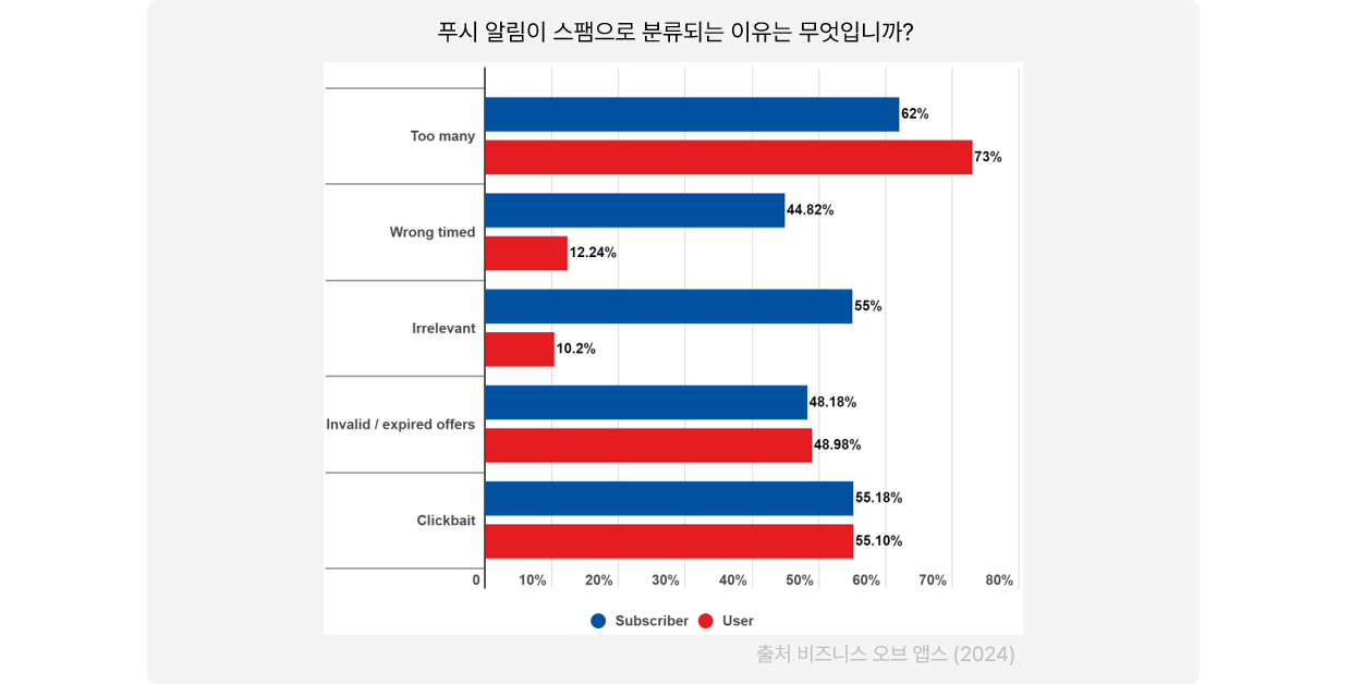 치열한 경쟁이 난무하는 앱 시장에서 사용자를 계속 참여시키기 위해서는 앱푸시 메시지는 핵심적인 역할을 해요. 그러나 생각 없이 사용하면 사용자가 앱을 완전히 지워버려서 전투에 참여를 할 수도 없게 될지도 모릅니다. 실제로 2023년 비즈니스오브앱의 통계에 따르면, 미국의 스마트폰 사용자는 평균 하루 46개의 앱 푸시 알림을 받지만, 푸시 알림에 반응하는 비율은 안드로이드 4.6%, iOS는 3.4%에 그친다고 합니다.