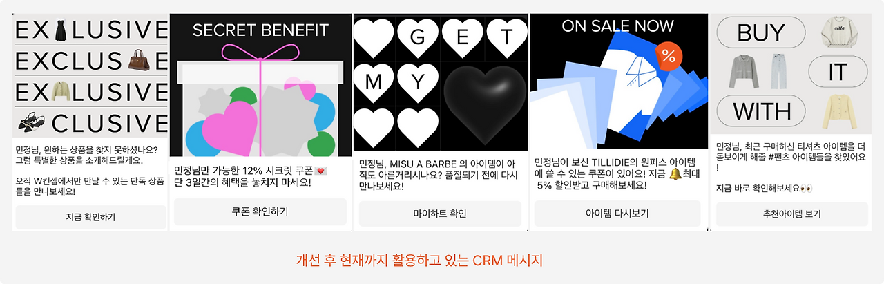 CRM 메시지는 보통 작은 이미지와 간략한 메시지 구성으로 커뮤니케이션 해야 했기 때문에 채널에 맞게 4가지 원칙으로 문구와 이미지 활용 방안을 제안했었어요. 1) 고객이 수신 즉시 한눈에 의도를 이해할 수 있도록 단순한 문구와 이미지 사용 2) 중복된 내용 제거 3) 메시지 인지를 돕는 일관성 있는 레이아웃 4) 브랜드 배너와의 이질감 줄일 것. 그 결과로 기존의 브랜드 메시지를 더욱 매력적으로 만들어주며 고객과의 지속적인 커뮤니케이션이 가능한 방안을 마련할 수 있었습니다.