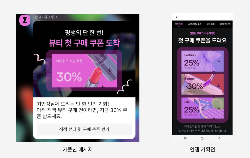일관된 브랜드 사용 경험을 위해서는 인앱 요소를 적극적으로 활용하고자 했습니다. 연계된 기획전의 쿠폰 이미지라든지, 인앱에서 사용된 찜하기 아이콘, 알림 아이콘 등의 사용으로 고객의 메시지 인지를 높였습니다.