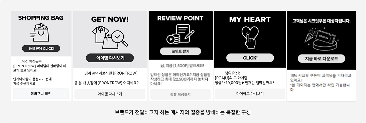 고객이 메시지를 받았을 때 한눈에 파악할 수 있는 단순한 구성이 필요했습니다. 이를 위해서는 사용되는 이미지와 문구가 '단 하나의 메시지'를 전달하고 있어야 했어요. 또한 플랫폼이 인앱에서 제공하고 있는 브랜드 커뮤니케이션과 동일한 결로 메시지를 전달하는 것이 고객의 일관된 경험을 제안할 수 있다고 보았습니다.