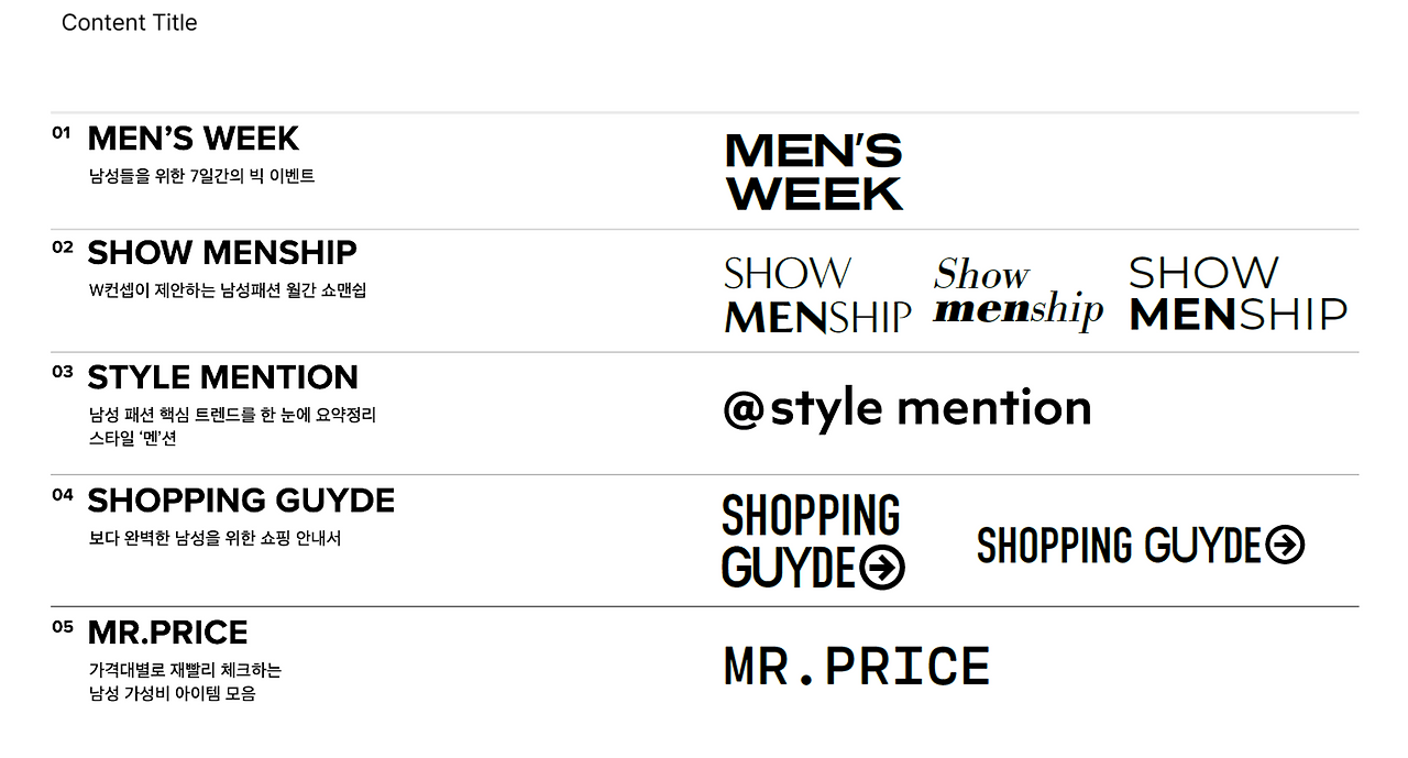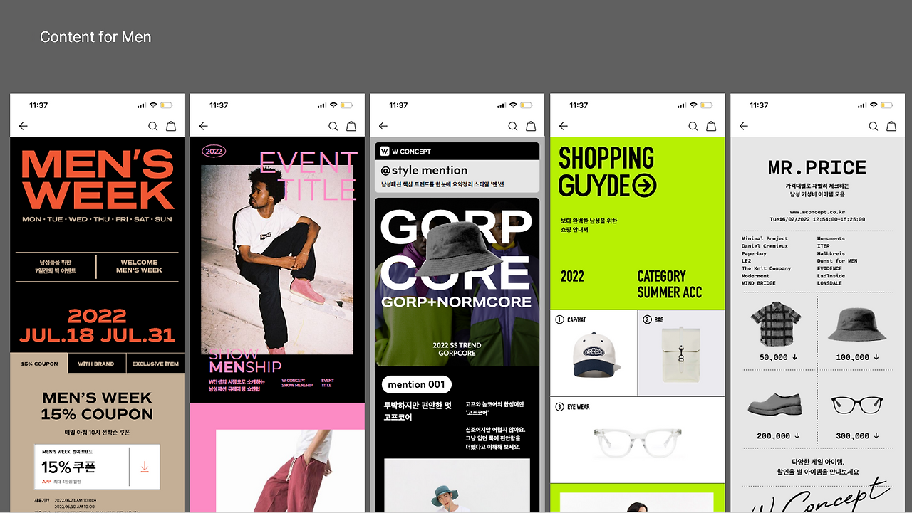 컨텐츠 네이밍과 키카피에서 확인하실 수 있듯이 타이틀 안에는 남성을 나타내는 단어를 계산적으로 숨겨두었어요. 그리고 키카피에서도 남성 쇼핑의 해답을 주는 듯한 메시지가 담겼습니다. 다섯가지 컨텐츠는 각각의 목적은 다르지만 W컨셉 맨이라는 하나의 아이덴티티를 알리기 위한 목표는 같았기 때문에 볼드한 서체나 강렬한 컬러, 직관적인 이미지의 사용에서는 일관된 방향을 따르고 있습니다.