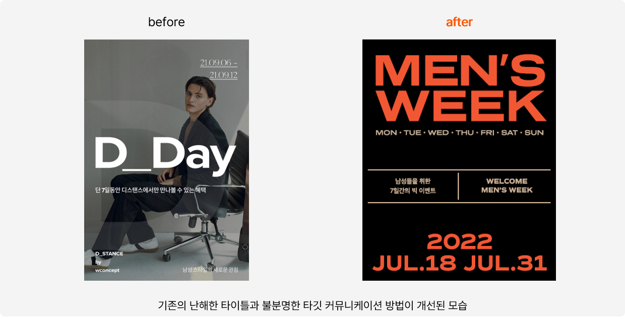 그전까지는 전달하는 이미지와 사용 언어를 보았을 때 맨의 성격을 직관적으로 드러내고 있지는 않습니다. 남성을 대상으로 제작된 컨텐츠는 대부분 기존 우먼 컨텐츠를 기반으로 제작되었습니다. 따라서 남성 고객이라는 타깃을 재설정하고, 맨 타깃에게 공감을 줄 수 있는 방식으로 커뮤니케이션을 진행하고자 했습니다.