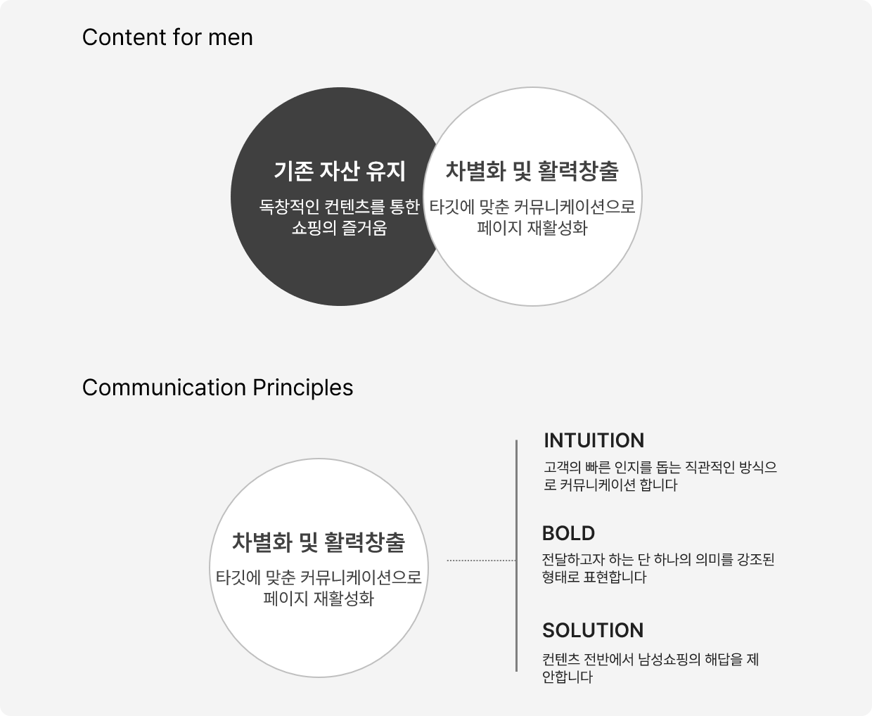 남성을 위한 주요 컨텐츠를 런칭하여 맨만의 명확한 아이덴티티를 확립하고 페이지의 재활성화를 기획했습니다. 이를 위해선 남성들의 쇼핑 귀차니즘을 꿰뚫고 이를 해소할 수 있는 문제 해결형 컨텐츠의 구성과 직관적인 카피가 필요하다고 판단 되었어요.