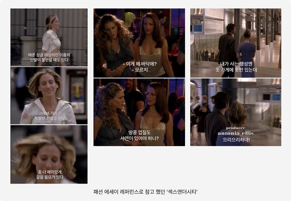패션 에세이에서 참고했던 레퍼런스는 저의 인생 바이블 '섹스앤더시티' 였는데요. 패션이라는 소재를 활용해서 그 안에서 일과 사랑, 우정에 대해 녹여낸 점이 2030 여성을 타깃으로 연재 한 패션 에세이의 지향점과 적합하다고 생각했어요.