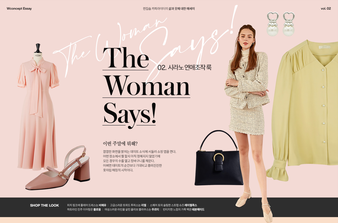 우리 플랫폼 내에서 인기 있는 아이템은 무엇이고, 베스트 브랜드는 무엇이지 먼저 확인했습니다. 에세이 발행 시점의 시즈널 이슈가 있는지도 봤어요. 살랑살랑 봄을 앞둔 시점이었고 페미닌한 원피스와 블라우스 구매율이 점차 올라가고 있었죠. 그렇게 에세이의 주제는 '소개팅'으로 정해졌습니다.