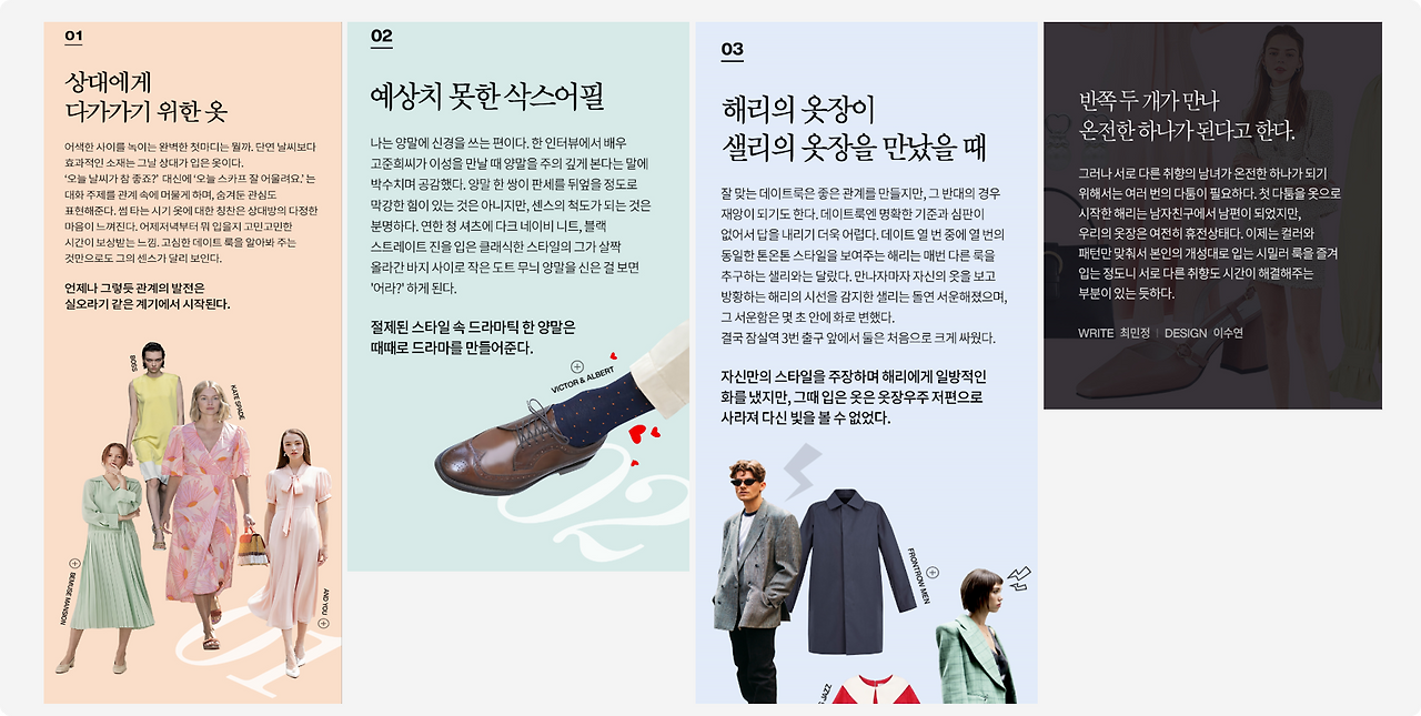 컨텐츠를 제작하게 된 목적이 있을거에요. 브랜드가 좀 더 감성적인 이미지로 고객과 소통하고 싶다던지, 혹은 고객의 일상과 연계된 브랜드 가치를 전달하고 싶다던지. 컨텐츠 컨셉은 브랜드 방향성에서 부터 시작하는 게 중요합니다. 패션 에세이는 브랜드가 좀 더 고객과 깊이 있는 관계를 만들기 위해 설계한 브랜디드 컨텐츠 중에 하나였어요.
