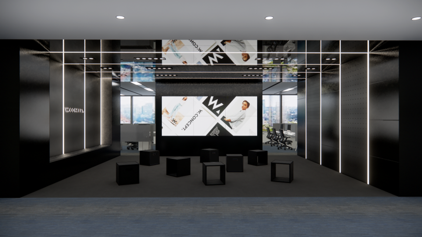 아이덴티티 존은 그렇게 구성되었습니다. 전체 공간에서 중심이 되어 포인트가 되어주는 곳이 바로 아이덴티티 존이었어요. 모두가 오가는 이곳에 커다란 LED 디스플레이를 배치하여 브랜드가 전달하고자 하는 가치와 이야기, 우리의 소식을 자주 전달하고자 했죠. 공간에는 잠시 앉아갈 수 있는 스툴도 배치했어요. 업무 공간 내 좌석 곳곳에 쓰여진 브랜드 슬로건 'WE CREATE THE CONCEPT'은 브랜드의 지향하는 바를 이야기함과 동시에, 개개인의 일의 도착지가 어디에 있는지 알려주고자 했습니다.