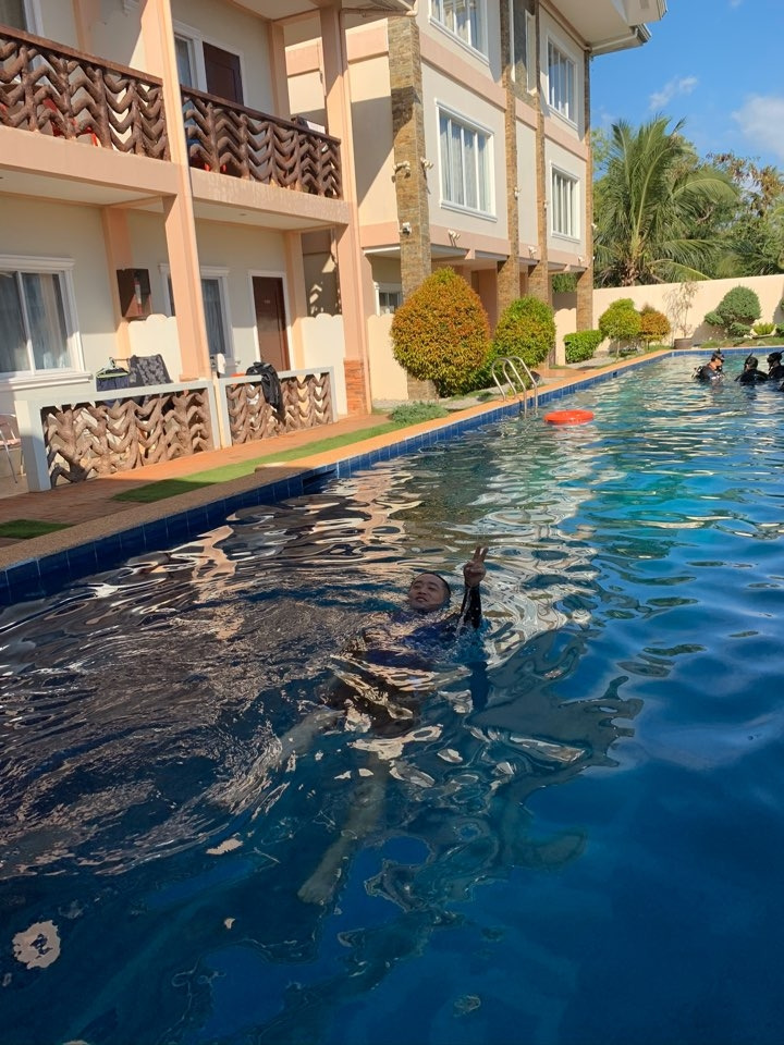 오전 이론 교육이 끝난 후에 점심을 먹고 잠시 휴식을 취했습니다. 그리고 1시부터 수영장에서 다이빙 실전 교육을 시작했습니다. 우리는 수영복으로 갈아입고 수영장으로 갔습니다. 필리핀 보홀의 한낮의 태양은 매우 강렬하고 뜨거웠습니다. 강사의 지도로 스쿠버 다이빙 장비 체크하는 법과 장비를 탈부착하는 법을 연습했습니다. 가장 중요한 목숨의 안전과 직결된 것이기 때문에 우리가 익숙해질 때까지 반복해서 연습했습니다. 처음 할 때 아무리 낯설고 두려운 것이라도 반복하다 보면 익숙해지기 마련입니다. 나에게 스쿠버 다이빙이 그렇습니다. 내 인생에서 전혀 마주할 일이 없을 것 같았던 장비들이 강사의 지도로 반복하다 보니 어느새 익숙해졌습니다.