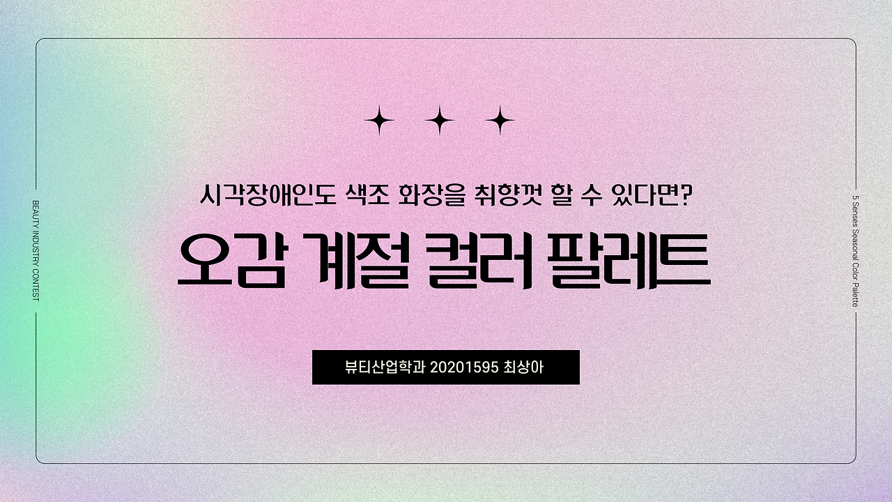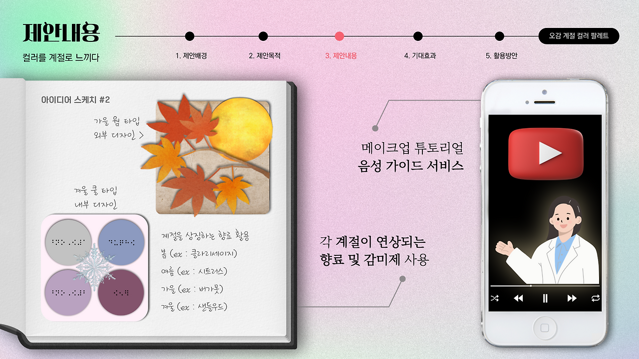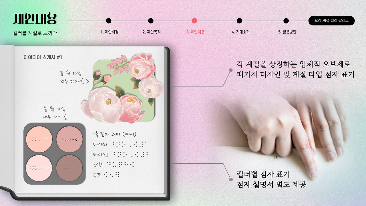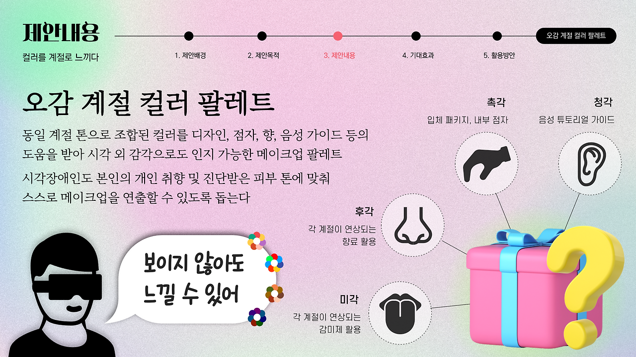 우리가 생각하는 것보다 시각장애인의 범위는 넓다. 운전면허 취득 자격은 없지만 일상생활에는 지장이 없는 색맹도 존재하고, 아예 암흑 속 다른 감각에만 의존하며 살아가는 맹인 또한 이 범주에 포함된다. 하지만 시각장애인도 분명 계절과 향에 따른 본인의 취향이 존재할 텐데 그에 해당하는 계절 컬러 타입의 팔레트를 사용한다면? 더해서 각 계절이 연상되는 향과 점자의 도움까지 있다면! 시각장애인의 선택의 폭을 넓히고, 메이크업 부담은 조금이나마 덜 수 있다 생각했다. 이에 나는 각기 다른 증상을 띄는 모든 시각장애인을 아울러 컬러를 '인식'하고 '분별'하는 데는 문제가 없지만 컬러 '조합'은 어려운 비장애인까지 본인의 퍼스널컬러 혹은 취향에 맞춰 사용 가능한 메이크업 색조 팔레트의 필요성을 느꼈다.