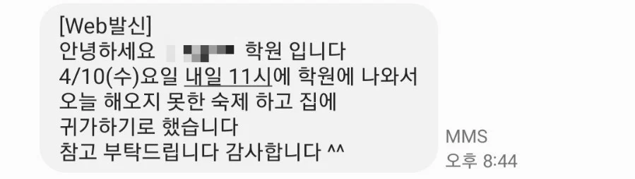 그런데 그날 저녁 학원에서 문자가 옵니다.