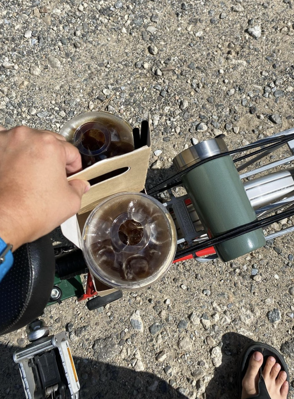 정말 다행히도, 여행 내내 날씨가 무척이나 좋았다. 아침이면 침낭을 훌훌 털어 차 문에 걸어 말리고 남편이 텐트를 정리하는 동안, 나는 자전거를 타고 근처 커피숍에 가서 커피를 테이크 아웃해왔다.