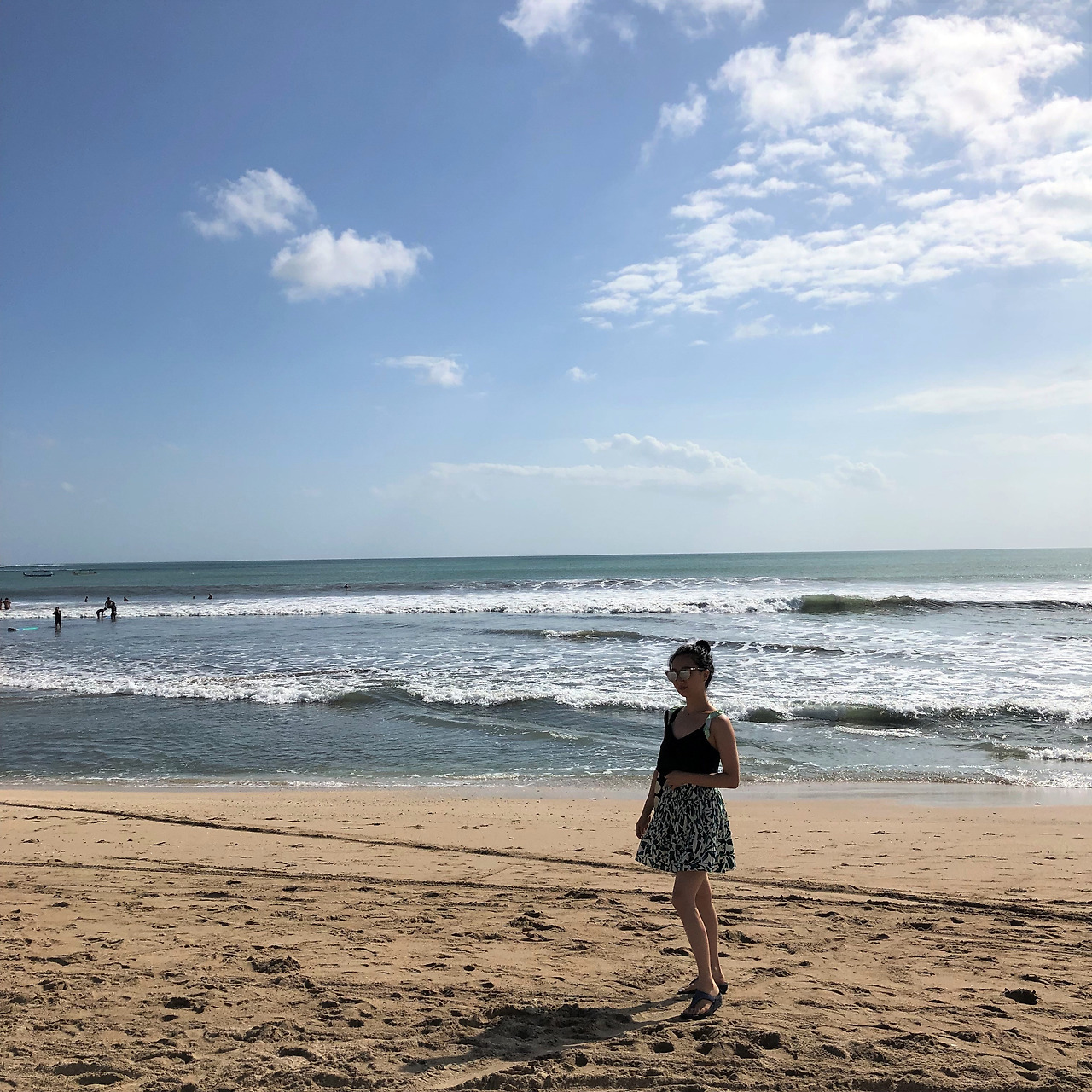 그녀가 찍은 사진을 보니, 나를 프레임 정 가운데에 두고 찍었다. 원래보다 더 짧게 보였다. 그래도 뭐 어쩔 수 없지. 일단 꾸따 해변에 있는 나를 남겼으니 만족하자 싶었다. 아니다. 나는 며칠간 그녀와 계속 다닐 테고, 내 사진을 찍어줄 사람은 그녀뿐인데. 그녀에게 한국식 사진 찍는 법을 알려줬다.