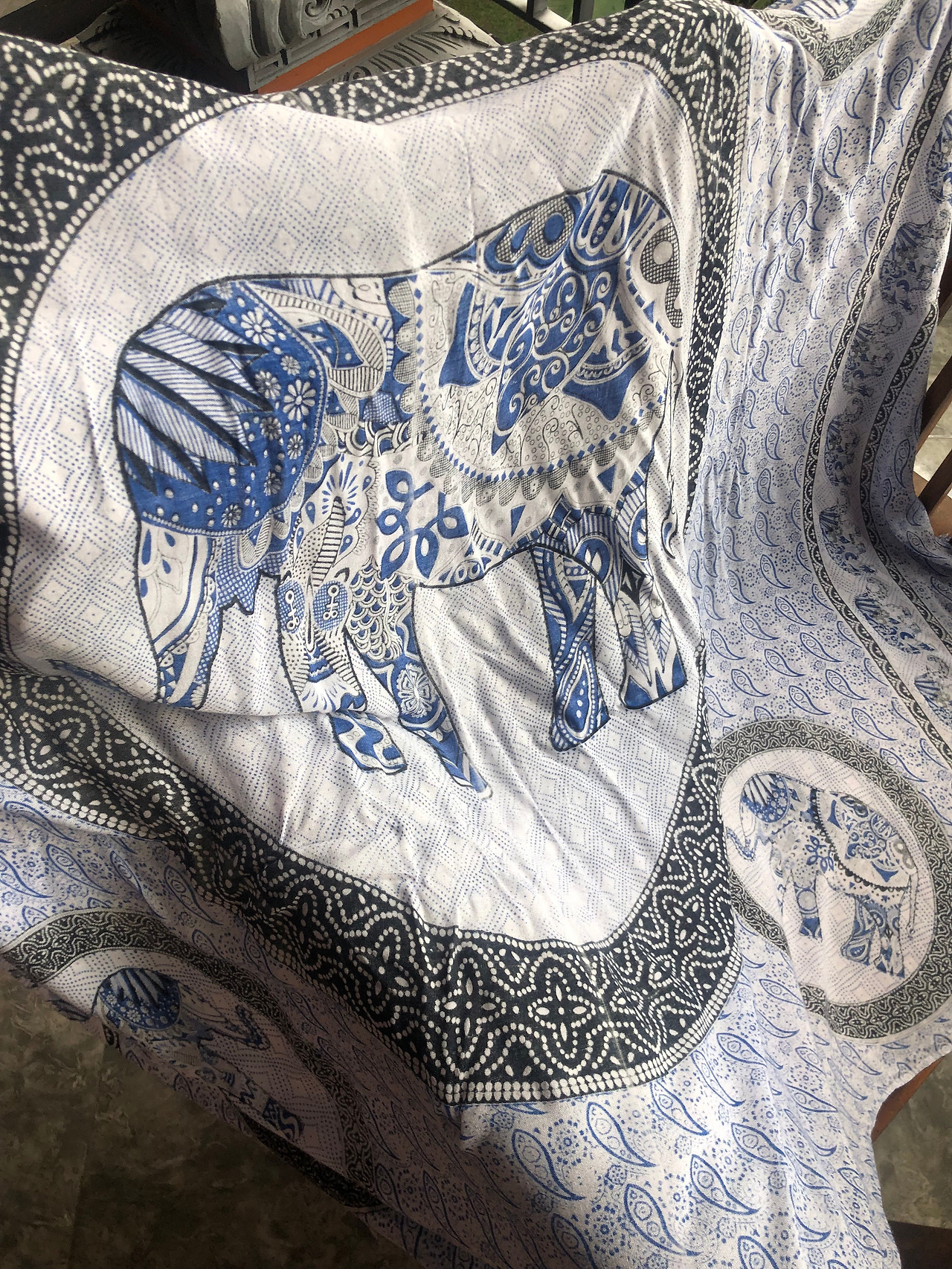 50루피와 200루피와의 간극은 무엇인가. 나는 단호하게 계속 50루피가 가장 합리적인 가격으로 생각된다고 말했다. 그녀는 200, 190, 150, 100까지 점점 가격을 내리더니, 결국 50루피에 주겠다고 했다. 나는 파란색, 흰색이 섞인 배경에 코끼리가 가운데 그려진 천을 골랐다.