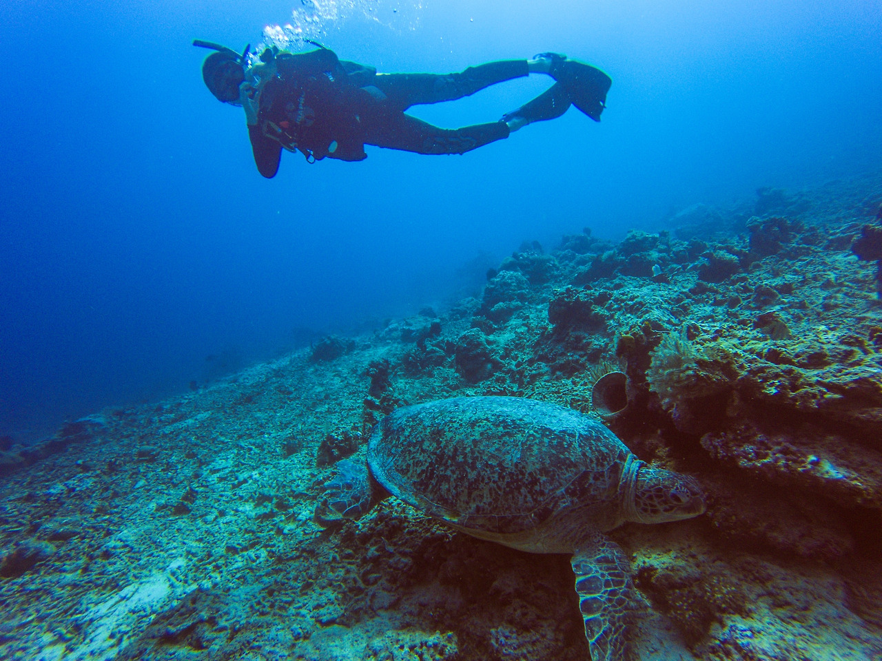 마지막 날은 아주 환상적인 다이빙을 할 수 있었다. 오프 워터 테스트는 10분 정도만 하고 다 끝났고 약 1시간 반 정도를 강사님과 함께 바닷속을 돌아다니며 구경만 했다. 길리 매노 동상과 7마리의 거북이, 화이트 팁 상어, 형형색색의 물고기를 맘껏 볼 수 있었다. 강사님은 좋은 포인트를 찾아서 고프로로 사진을 찍어줬고, 내가 문제없이 잘 있는지 끊임없이 체크해 주셨다.