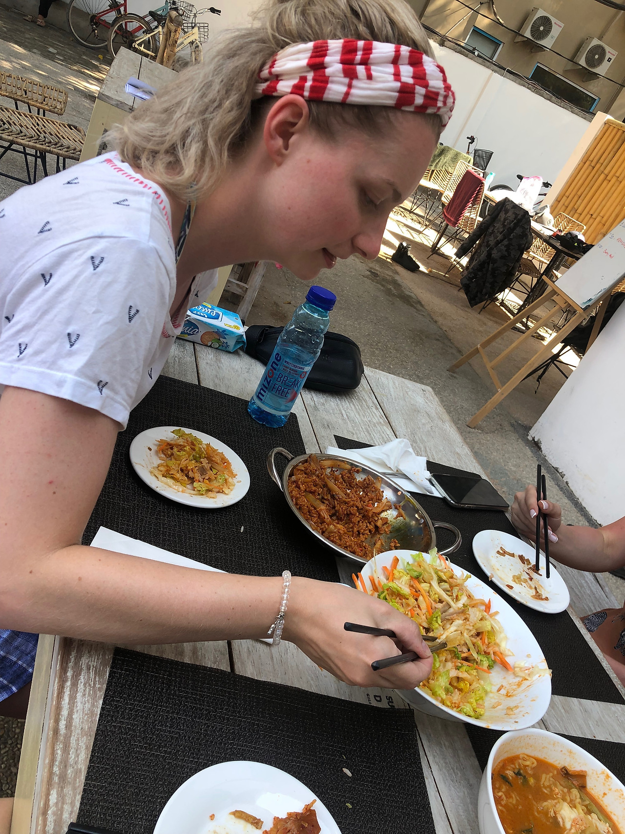그러나 그녀는 몇 번 알려주지도 않았는데, 금세 젓가락으로 누들을 집어 먹기 시작했다.