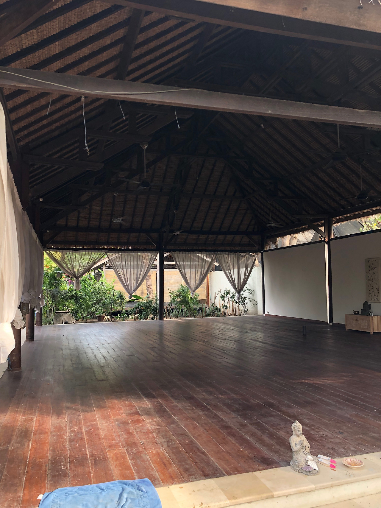 모닝 플로우 요가답게 '기지개'키는 기분이었다. 몸을 천천히 부드럽게 이완시키며, 일깨워나갔다. 그런데! 마지막에 할라 사나(쟁기 자세: 등을 대고 누워서, 다리를 들어 올려 머리 뒤로 넘기는 자세)를 하는데 발이 땅에 닿질 않았다. 요가를 하면서 겪은 최초의 경험이라 당황스러웠다. 하다 보면 나아지리라 하며, 3 class card를 구매하길 잘했다고 생각했다. 길리에서 머무는 5박 6일 중에 3번 가는 건 어렵지 않을 테니.