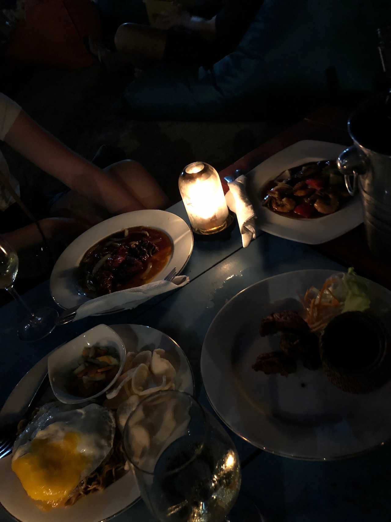 우리는 샌드 바로 향했다. 화이트 와인과 여러 디쉬를 주문해서 셰어 하기로 했다. 음식이 나오고 보니, 무슨 양이 한입거리도 안되어 보였다. 사람은 5명이 었지만, 양이 많을 줄 알고 4개만 주문했었다. 볶음면, 치킨, 새우볶음, 소고기 볶음. 포크와 스푼도 딱 4개씩만 나왔다. 우리는 각자 아무거나 주워 잡고 먹기 시작했다. 그러나 자전거를 거의 3시간 동안 탔던 나는 정말 정말 배가 고팠다. 다른 애들도 그랬을 텐데. 우리는 덩어리를 다 집어먹고 탄수화물이 부족하다는 것을 느끼고 밥을 추가 주문을 했다.