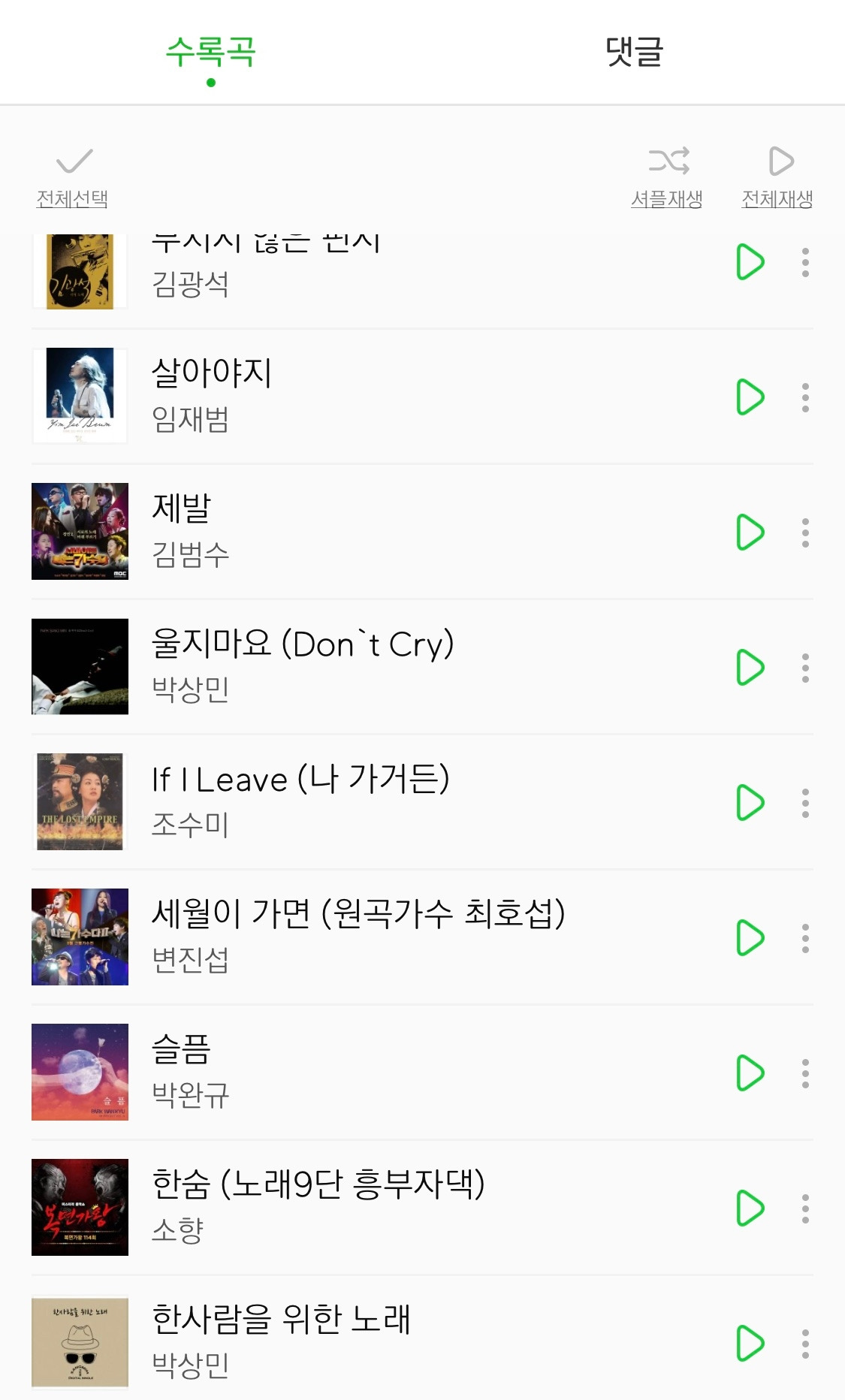 아빠는 갑작스럽게 두 번째 수술을 해야 했다. 집에 언제 돌아올 수 있을지는 의사도 우리도 알 수 없었다. 퇴근하고 아빠를 보러 갔다. 아빠는 멀뚱하게 누워있다가 나를 보더니 환하게 웃어주었다. 침대 밖으로 나올 수 없는 그를 위해 무언가 해주고 싶었다. 평소 듣던 노래를 들려주면 좋아할 것 같았다. 나는 아빠가 어떤 가수, 어떤 노래를 좋아하는지 몇 개 밖에 몰랐다. 가족과 함께 쓰는 음악사이트에서 다운로드 내역을 확인했다. 내가 다운로드하지 않은 노래를 고르기만 하면 되었다. 그 노래를 플레이 리스트에 추가했다.