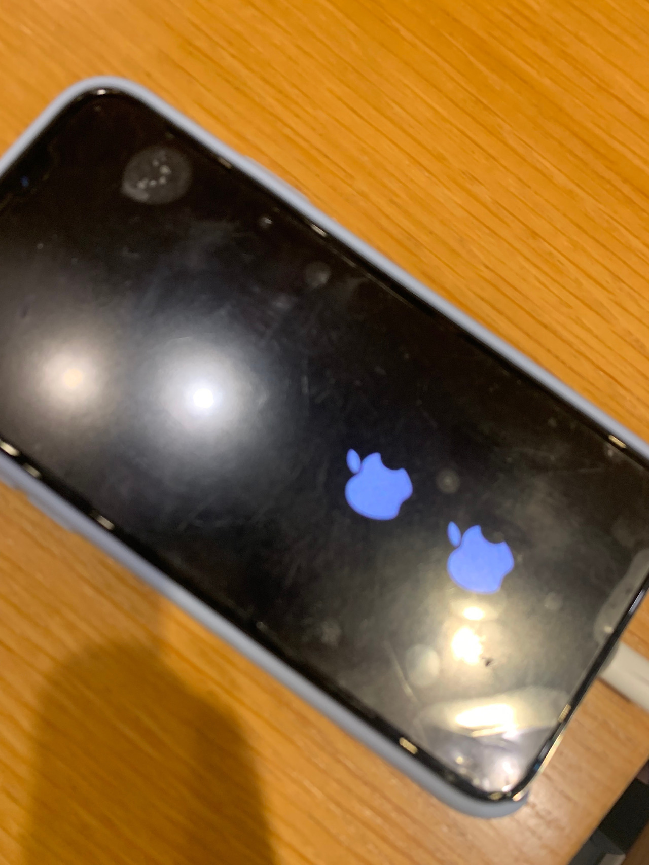 "웅! 이거 케이스가 튼튼해서 괜찮아. 음… 응? 꺼졌네. 음… 검정 바탕에 사과가 두 개나 떠 있네. "
