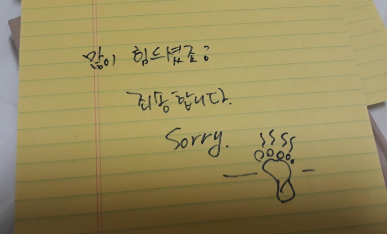 원인은 찾았지만 이것 참 난감한 문제였다. 내가 아무리 겁나는 게 없던 강아지 마이웨이 시절이었지만 그렇다고 해도 조용한 열람실에서 열공중인 학우에게 ‘너 지금 발냄새가 무지 하게 많이 나니 좀 꺼져주실래요?’ 라고 외칠 수는 없었다. 그래서 생각 끝에 노트 한 귀퉁이에 메모를 남겼다.