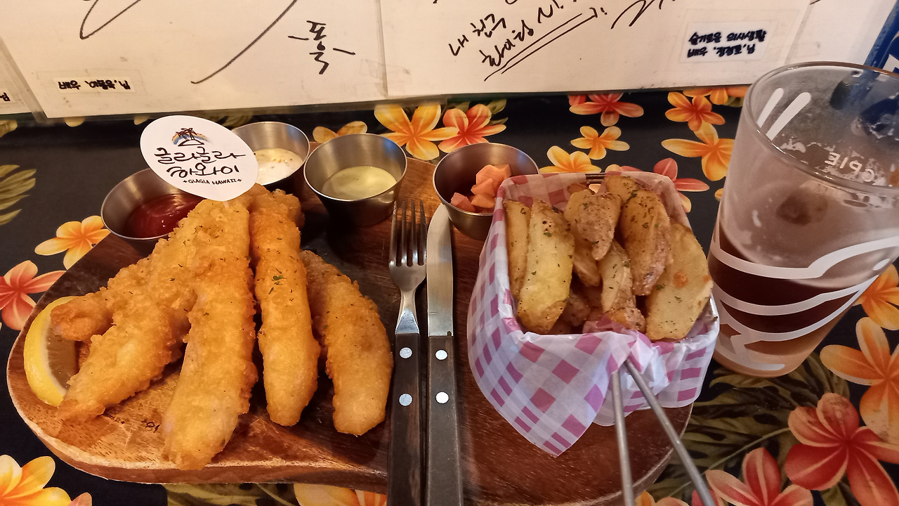 혼자 여행을 다니면 밥 먹는 일이 제일 힘든 일이라고 하는데, 나는 여행 내내 혼자서도 야무지게 잘 찾아먹고 다녔다. 길을 잘못 들어 인파에 치이며 질려가던 차에 우연히 발견한 ‘혼밥’전문 식당이나(실제로 3인분 이상은 안 파신다고.), 평소라면 사람들로 복작거렸을텐데 비가 쏟아지는 바람에 한적했던 공천포의 작은 식당이나, 길게 줄을 서야 한다던 서귀포 매일올레시장의 돼지김치말이 등등을 아무 기다림 없이, 눈치(?)보는 일 없이 먹으면서 따박따박 배를 불렸다. 비가 쏟아지고, 바람이 불던 마지막 밤은 숙소 옆 작은 와인바에서 혼술을 하며 여행을 마무리하는 호사까지 누렸으니 이만하면 선방이다.