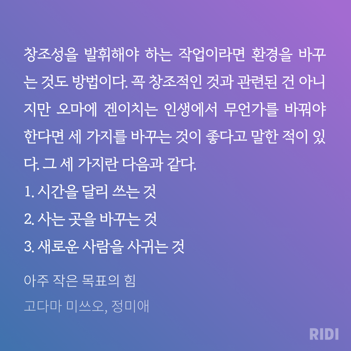 창조성은 그냥 발휘되는 것이 아닙니다. 행동(장소, 시간, 사람의 변화)을 통해서 얻어집니다. 물론 목욕을 하다가 갑자기 '유레카'를 외칠 수도 있습니다.