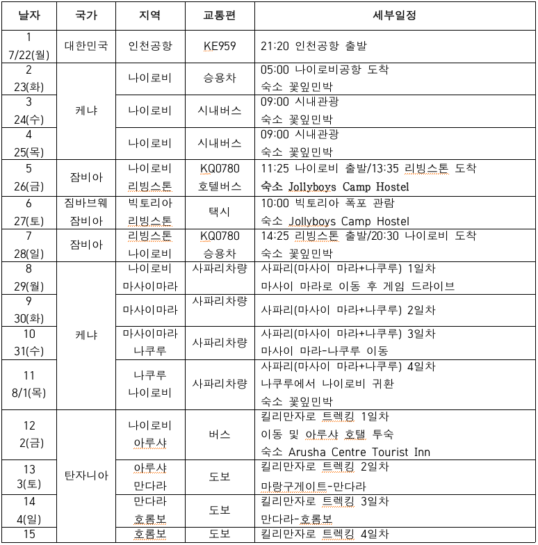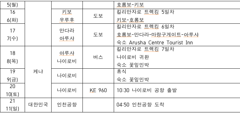 나중에 이야기 하겠지만 루트 중간 해발 3,700미터 호롬보에서 2박을 하면서 고소 적응훈련도 하고 체력도 비축해야 한다. 킬리만자로 트레킹을 온 한국 단체관광객들은 모두 호롬보 2박을 포함해 5박 6일 일정이었다.
